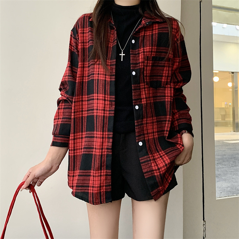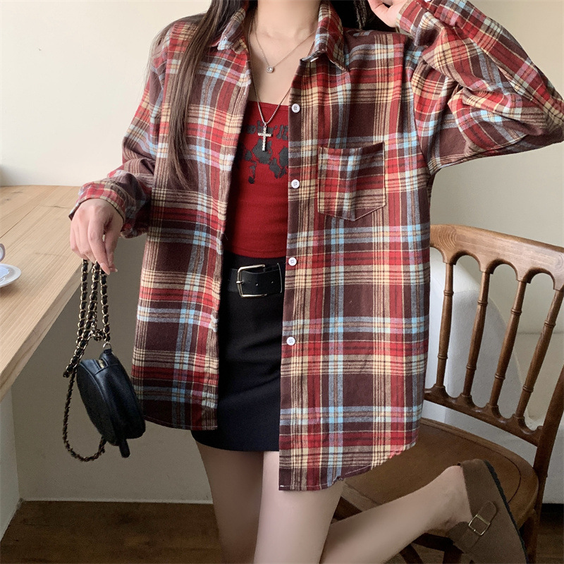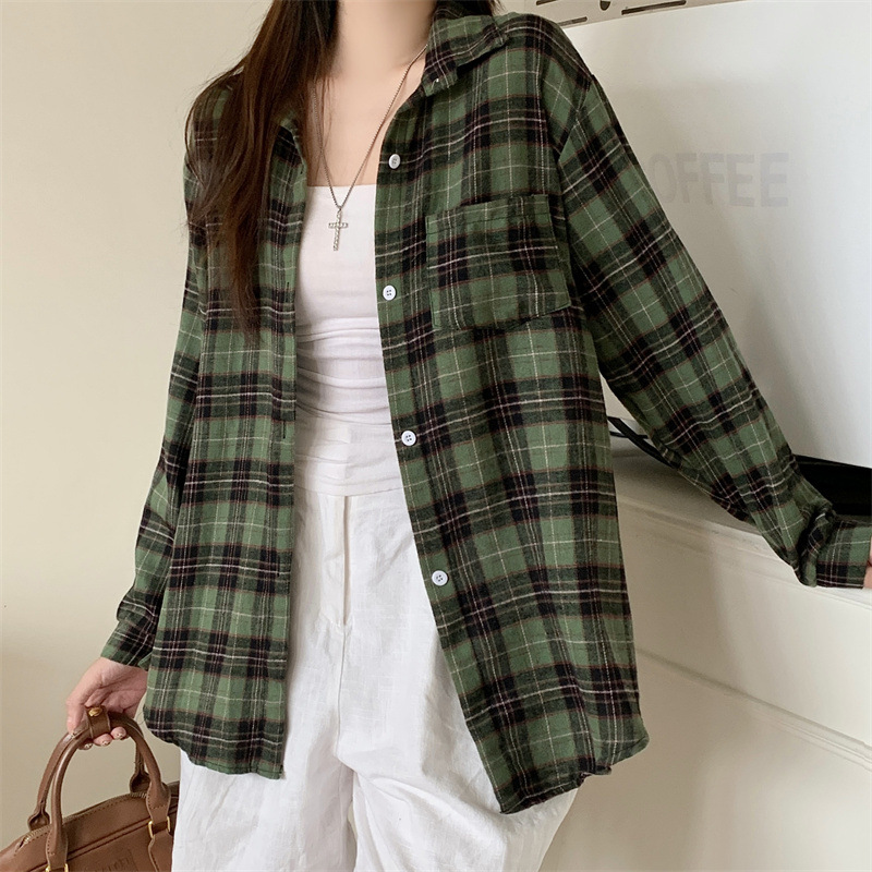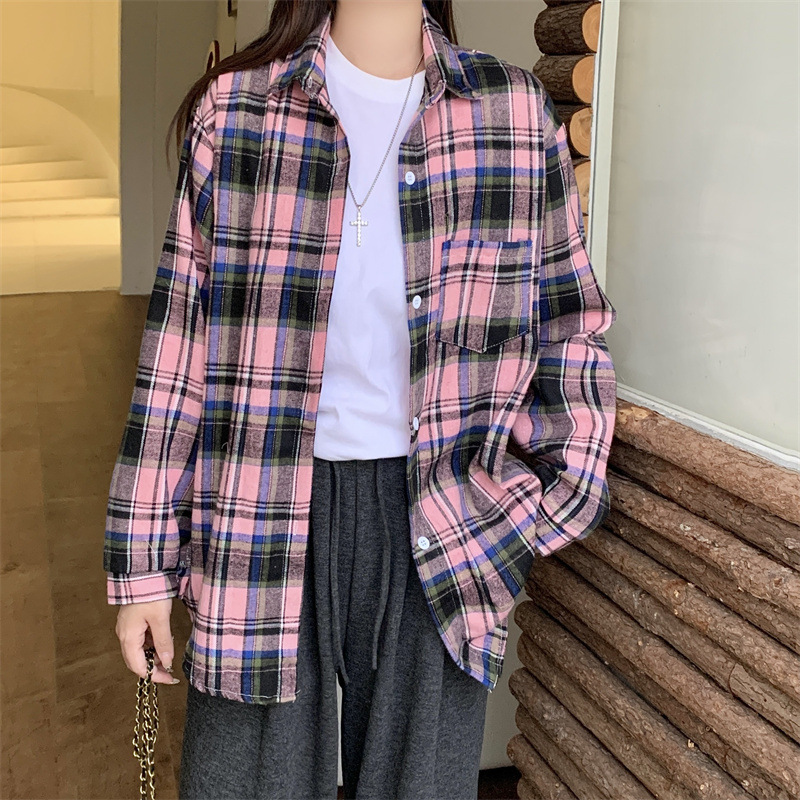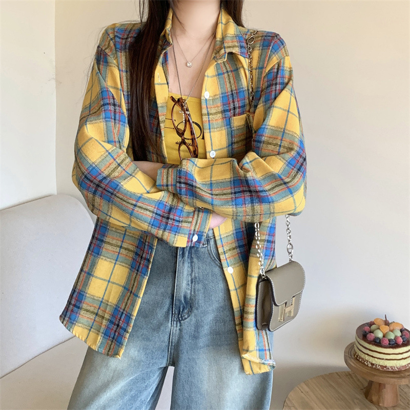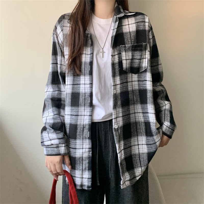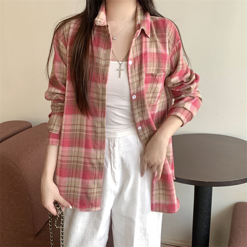 부드러운 달콤한 스타일 소녀의 Bm 블루 격자 무늬 느슨한 긴 소매 셔츠 여성의 중간 길이의 선 스크린 코트 트렌디스토어 가기