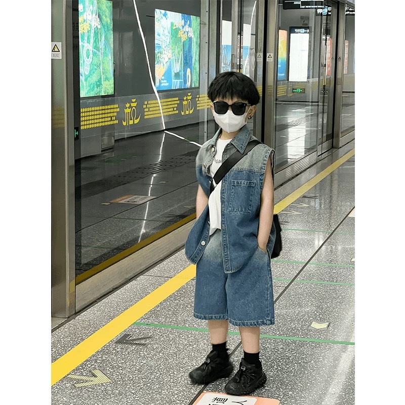 남자 데님 세트 여름 한국 스타일 유행 캐주얼 민소매 조끼 느슨한 넓은 다리 짧은 바지 투피스 세트스토어 가기