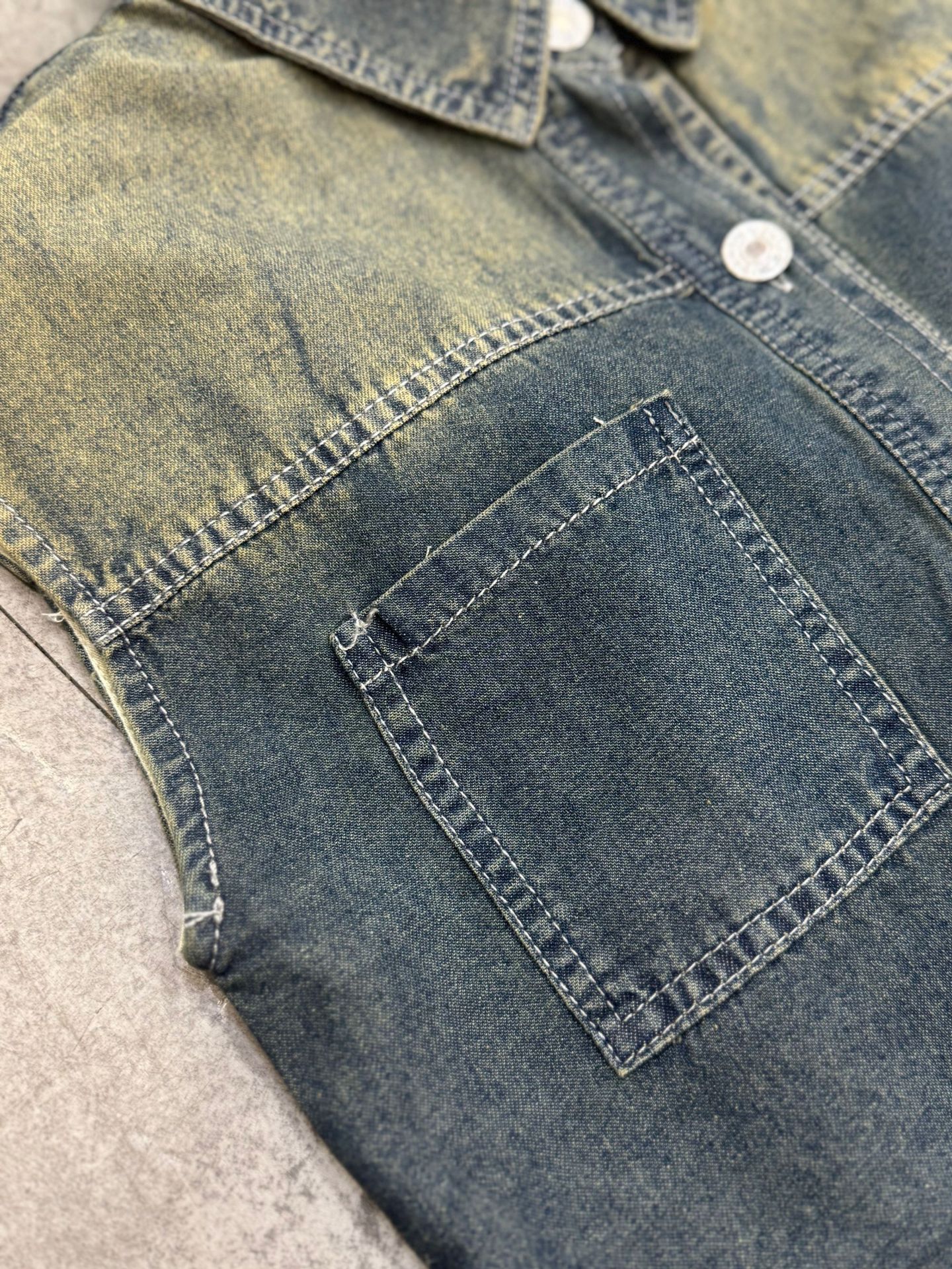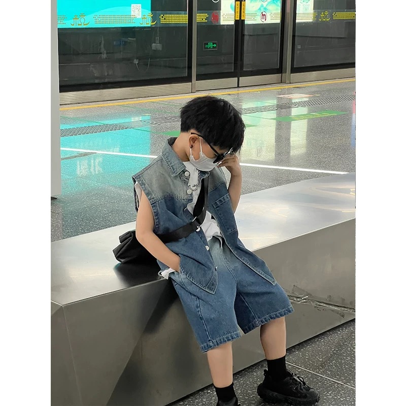 남자 데님 세트 여름 한국 스타일 유행 캐주얼 민소매 조끼 느슨한 넓은 다리 짧은 바지 투피스 세트