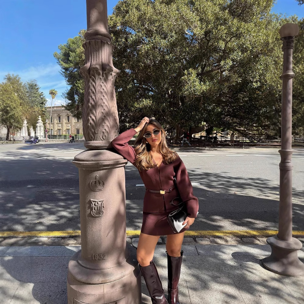 유럽과 미국 스타일의 국경 대외 무역 여성의 2025 패션 간단한 V-넥 니트 슬림 카디건 코트 스커트 세트스토어 가기