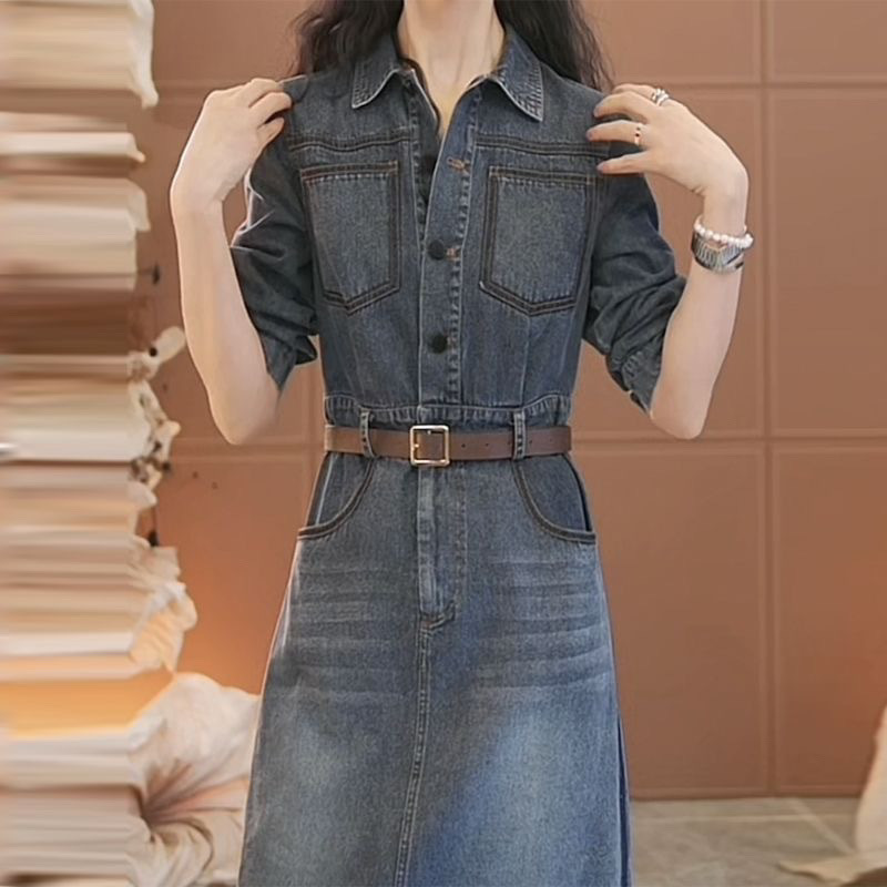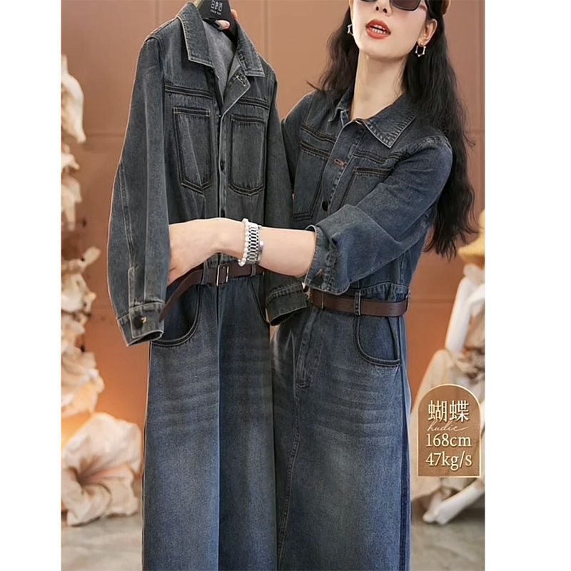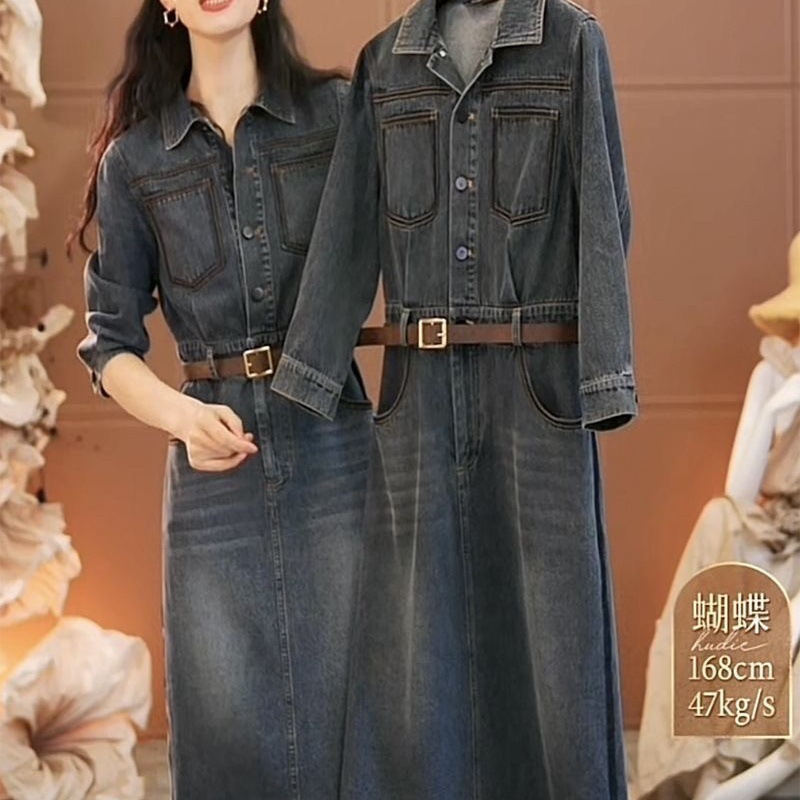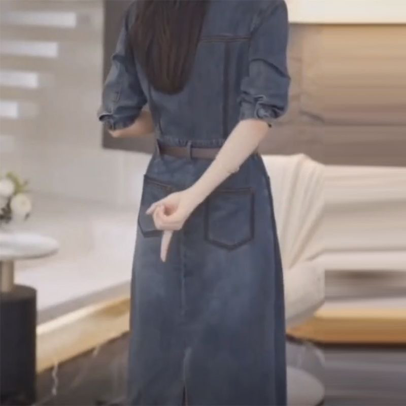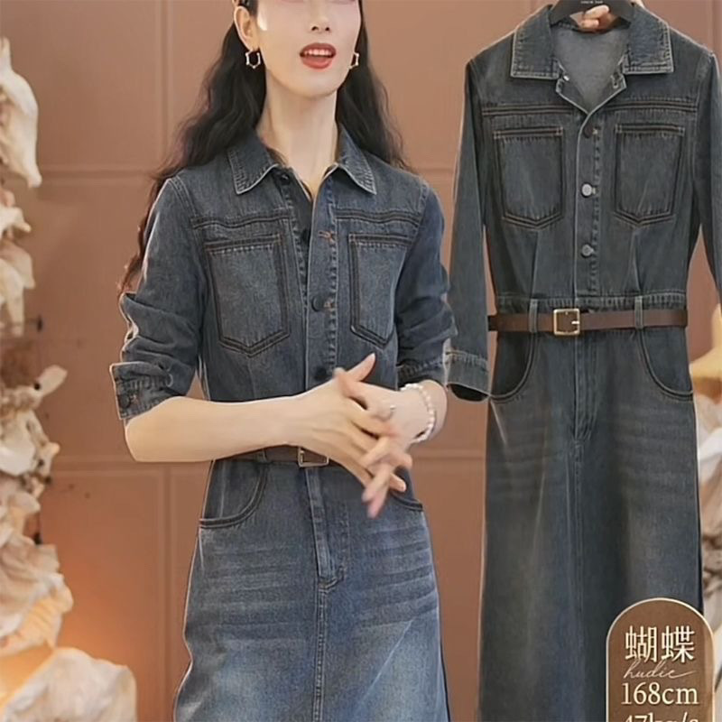 하이 엔드 세탁 뉴 데님 원피스 여성 중장 2024 가을 우아한 슬림 핏 허리 나이 감소 데님 스커트스토어 가기