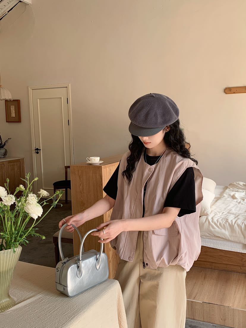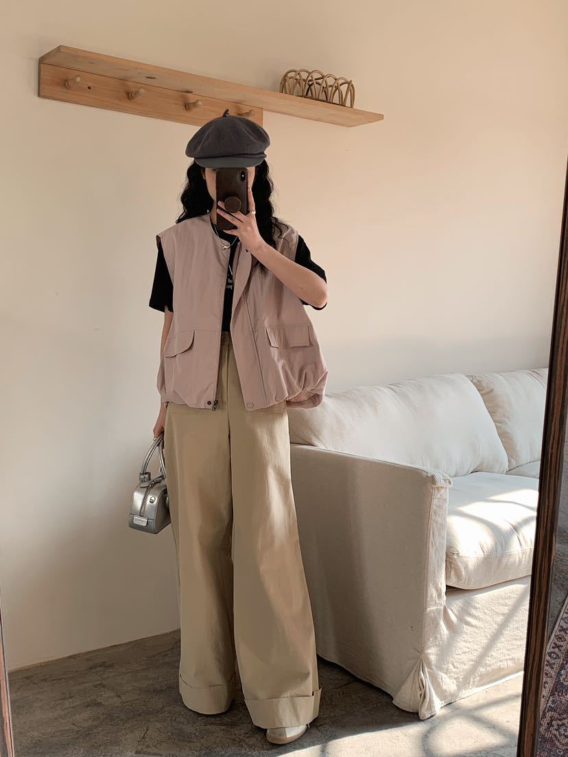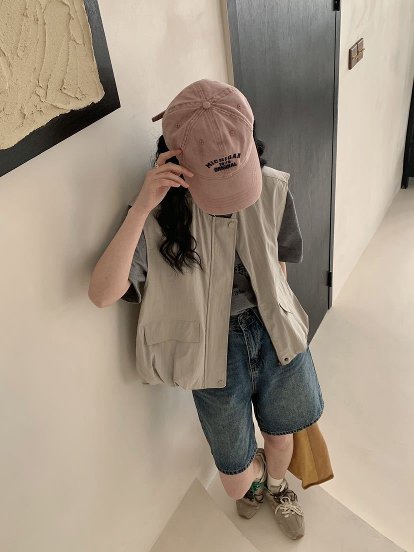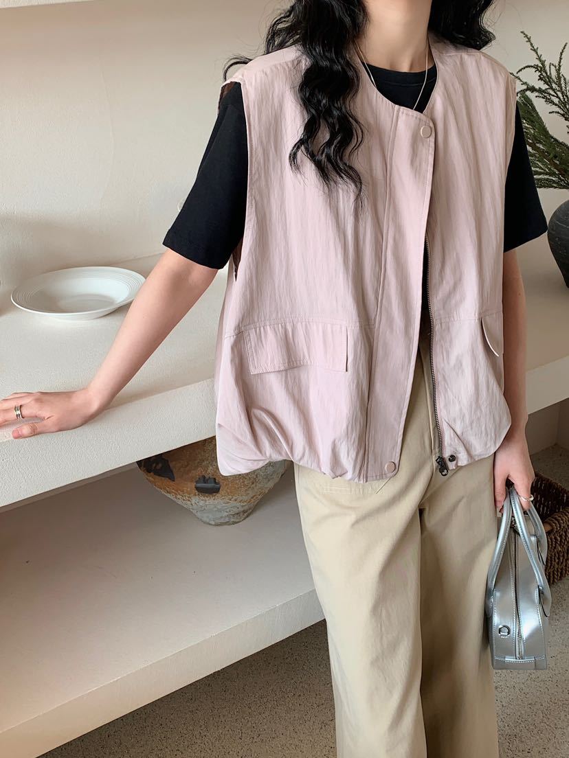 2025 봄 새로운 라운드 넥 조끼 일본 민소매 재킷 여성 디자인 솔리드 컬러 더블 포켓 지퍼 조끼스토어 가기