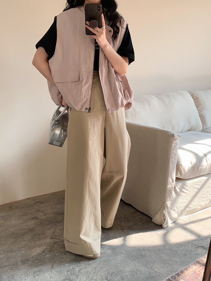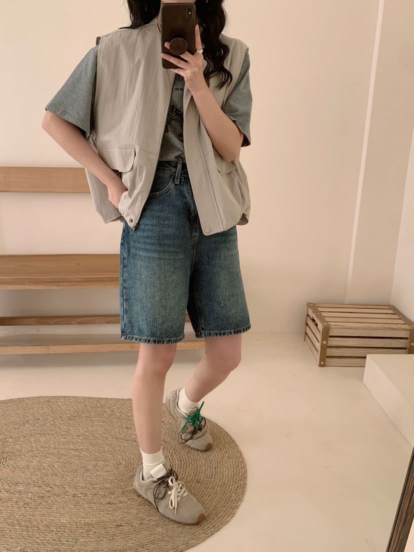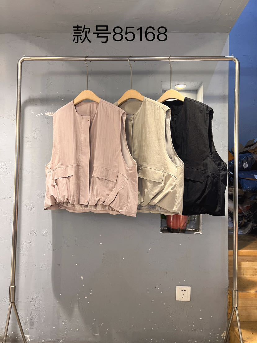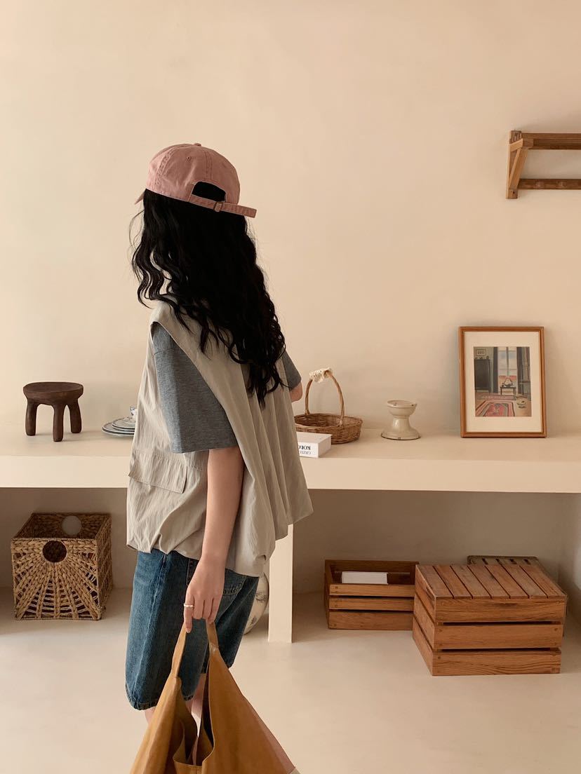 2025 봄 새로운 라운드 넥 조끼 일본 민소매 재킷 여성 디자인 솔리드 컬러 더블 포켓 지퍼 조끼스토어 가기