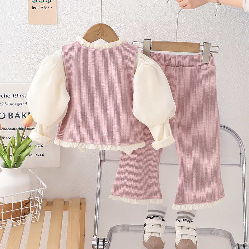 2025 새로운 서양식 어린이 유행 아기 봄과 가을 샤넬 스타일 조끼 긴 소매 3 피스 세트 소녀의 봄 세트
