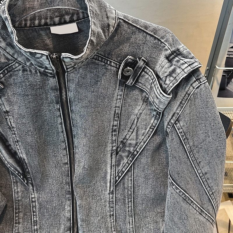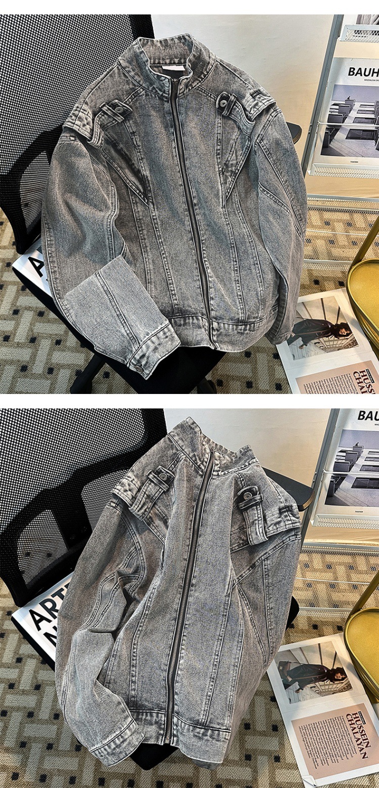 미국 레트로 중공업 스티칭 짧은 데님 자켓 트렌디 브랜드 유럽 및 미국 거리 클린 핏 바이커 재킷 남성용스토어 가기