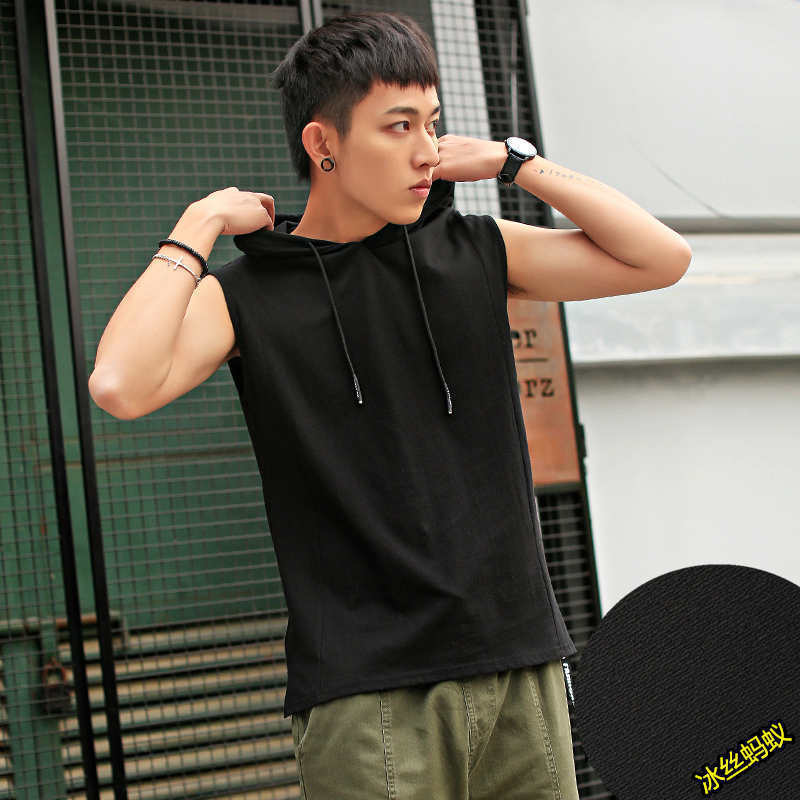민소매 티셔츠 남성용 여름 한국 스타일 웨어 슬리브 조끼 모자와 어깨 짧은 소매 후디 남성용 스웨터 티셔츠