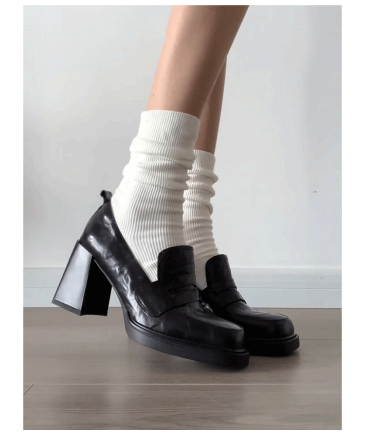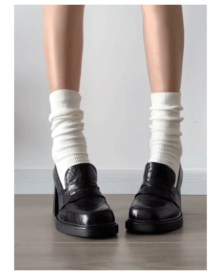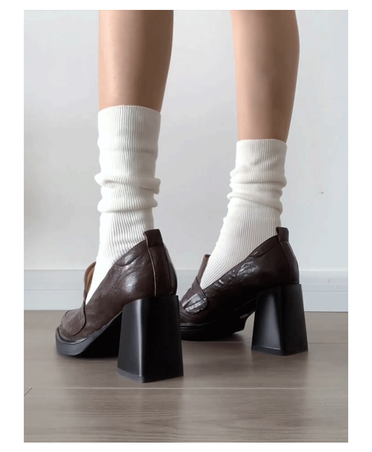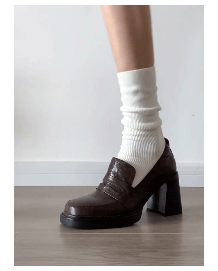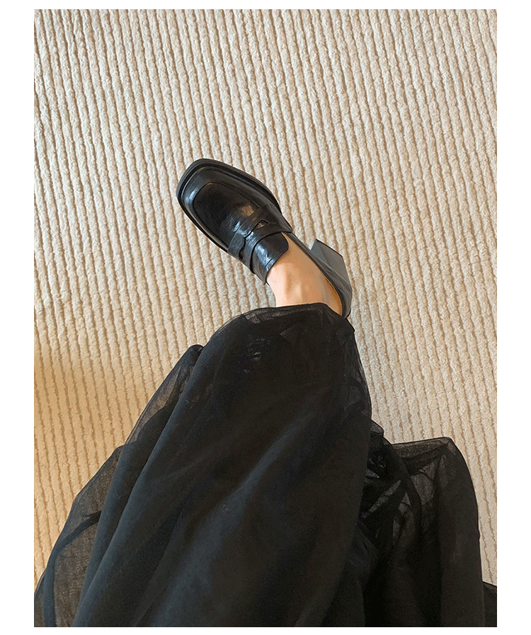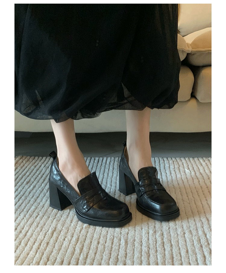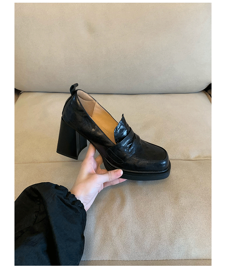 Cowhide Edition ~ Retro 영국 하이힐 가죽 신발 여성용 두꺼운 굽이 슬립 온 로퍼 스퀘어 토 칼리지 스타일 JK 여성 신발스토어 가기