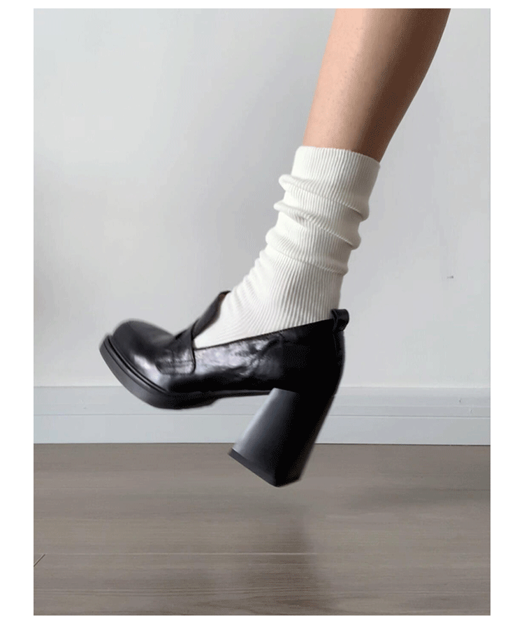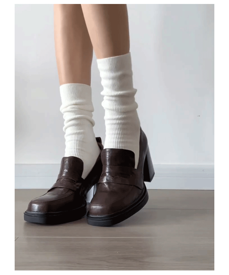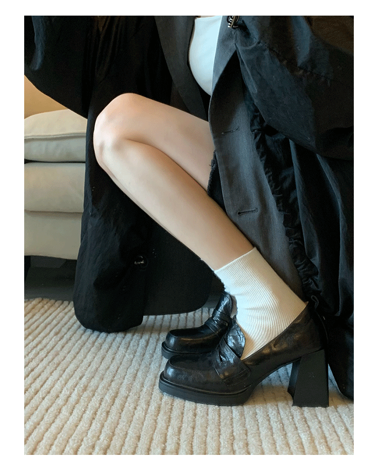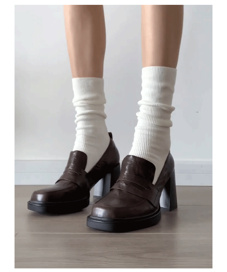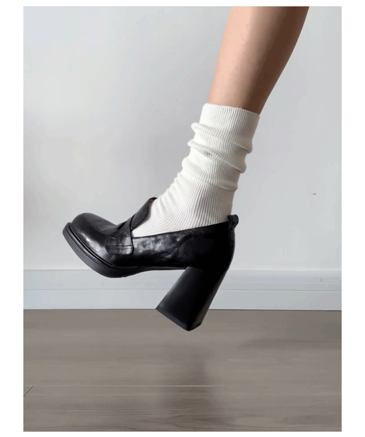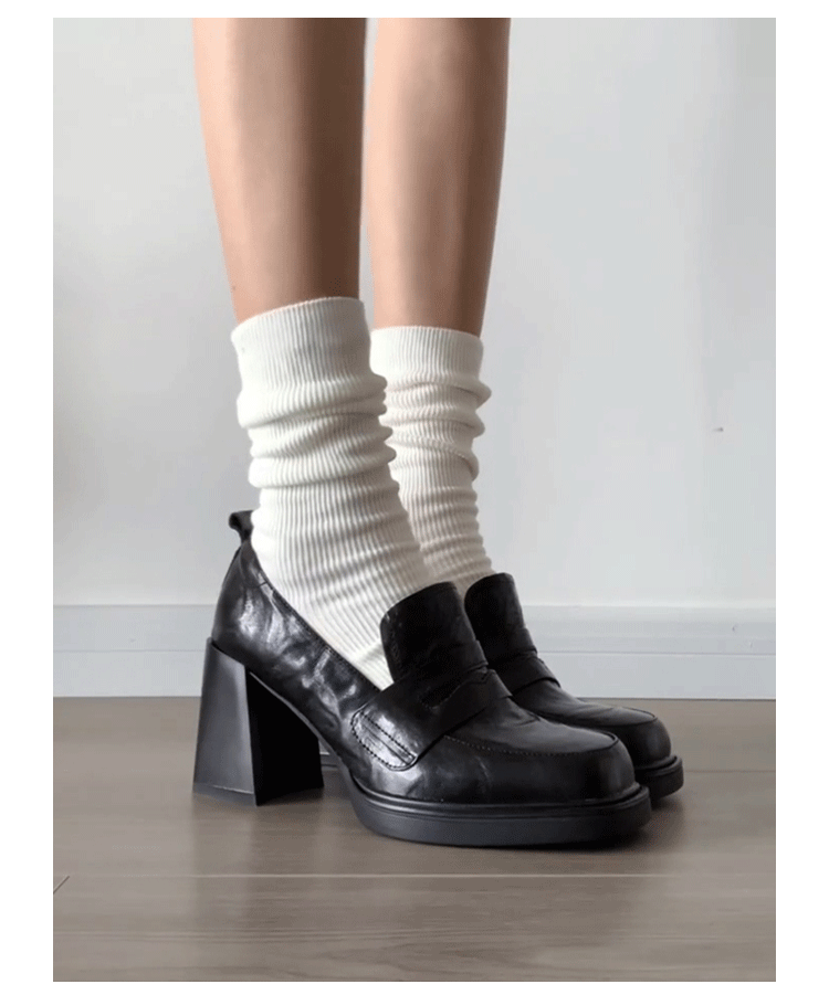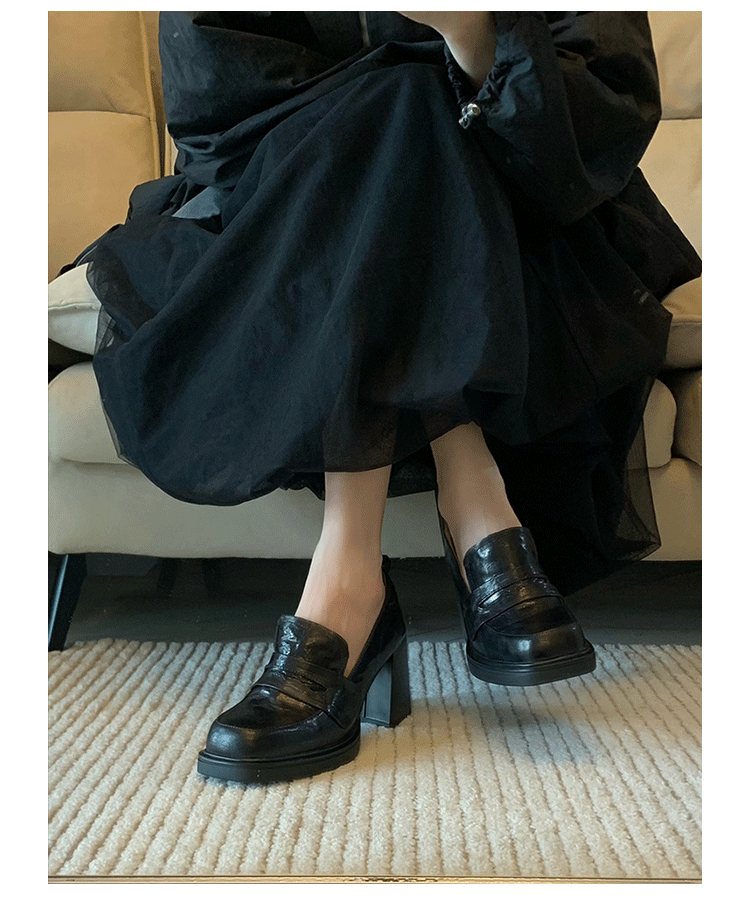 Cowhide Edition ~ Retro 영국 하이힐 가죽 신발 여성용 두꺼운 굽이 슬립 온 로퍼 스퀘어 토 칼리지 스타일 JK 여성 신발스토어 가기