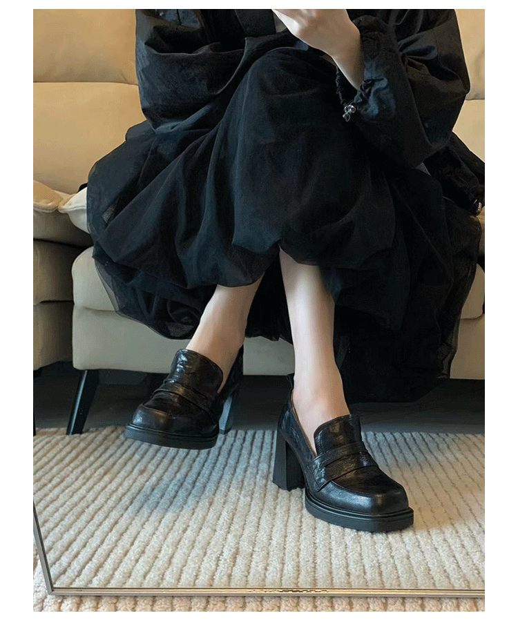 Cowhide Edition ~ Retro 영국 하이힐 가죽 신발 여성용 두꺼운 굽이 슬립 온 로퍼 스퀘어 토 칼리지 스타일 JK 여성 신발