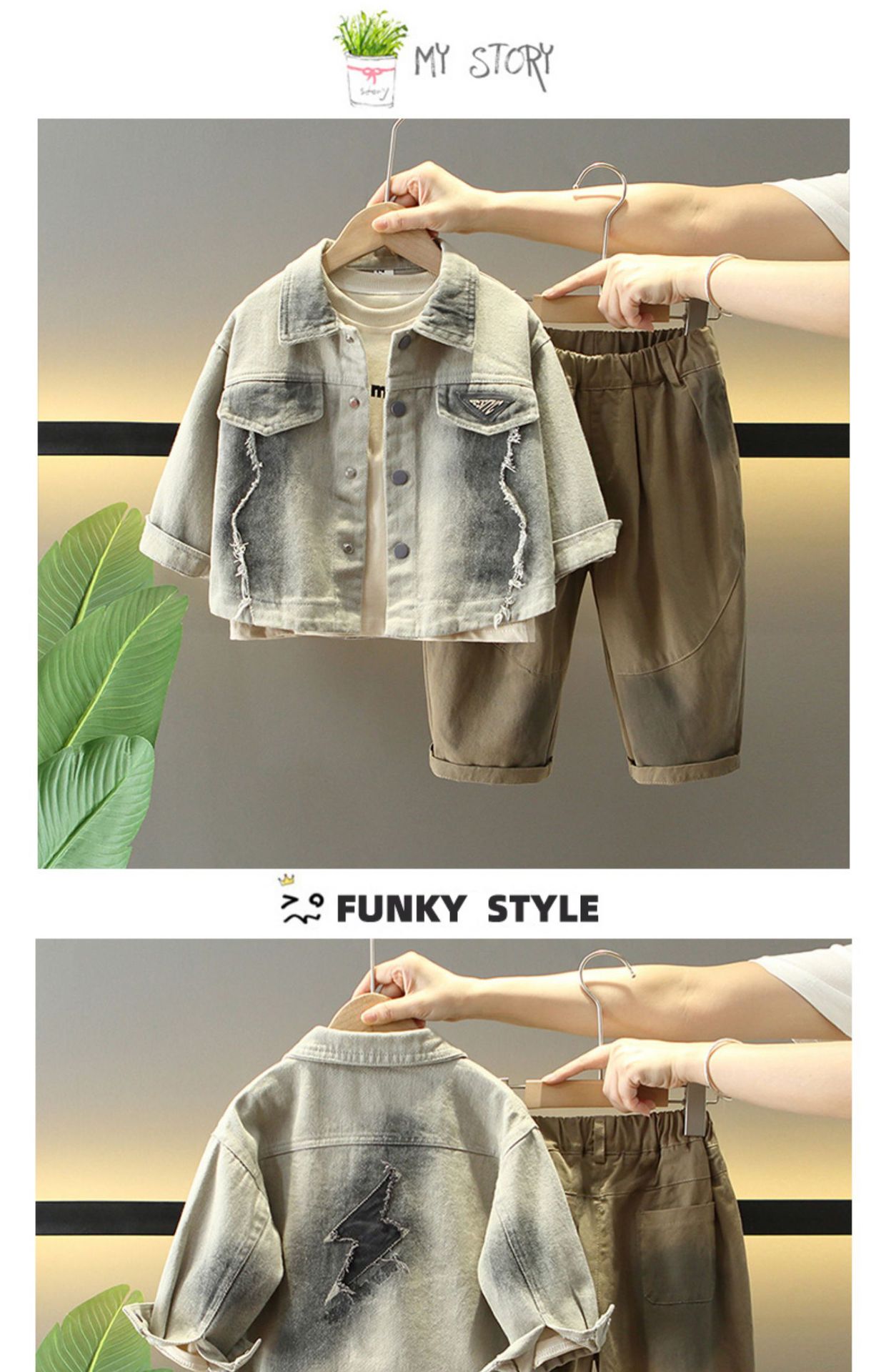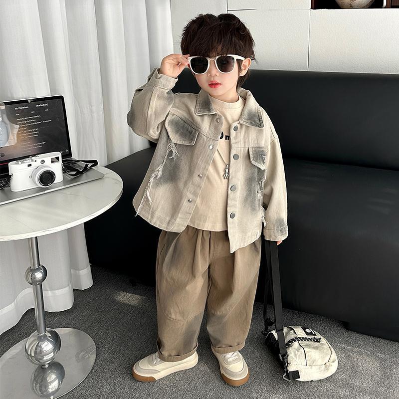 7058 소년 봄과 가을 세트 2025 새로운 한국 어린이 러피 잘 생긴 스프레이 염색 코트 3 피스 아기스토어 가기