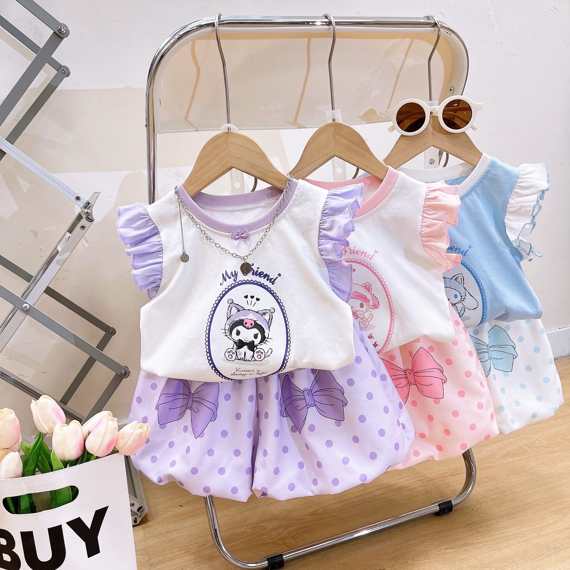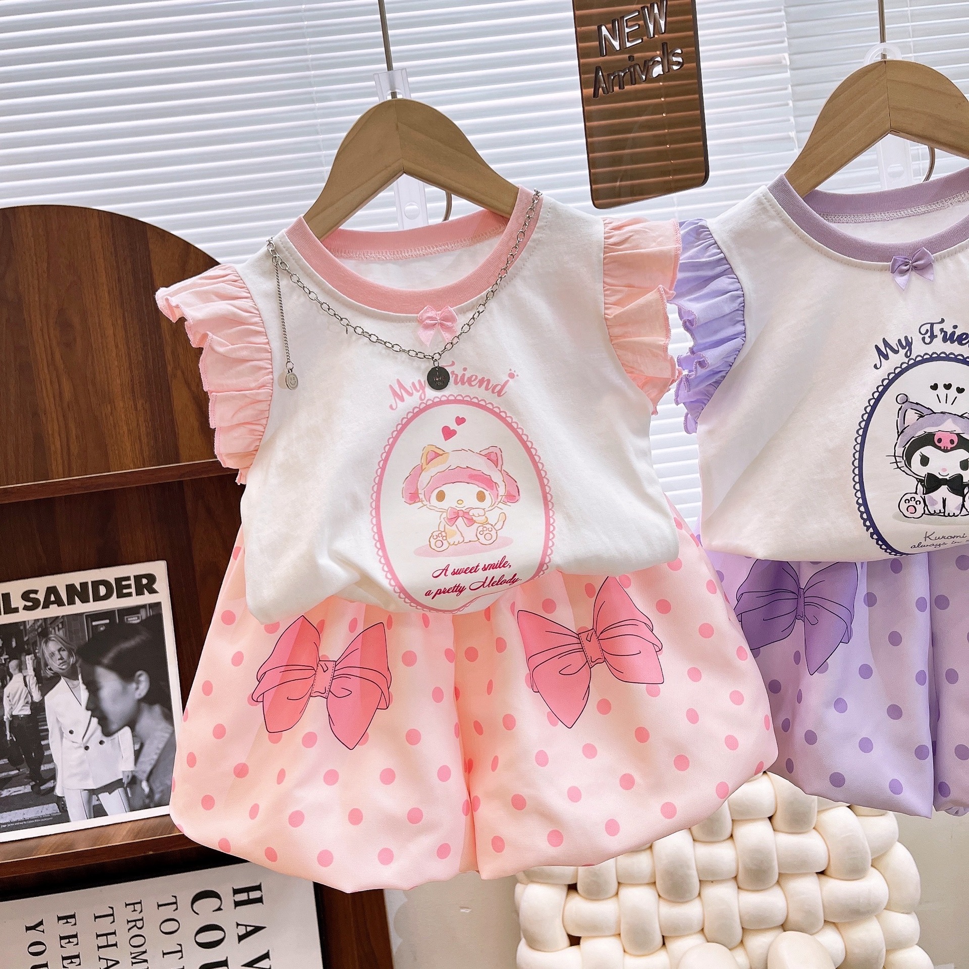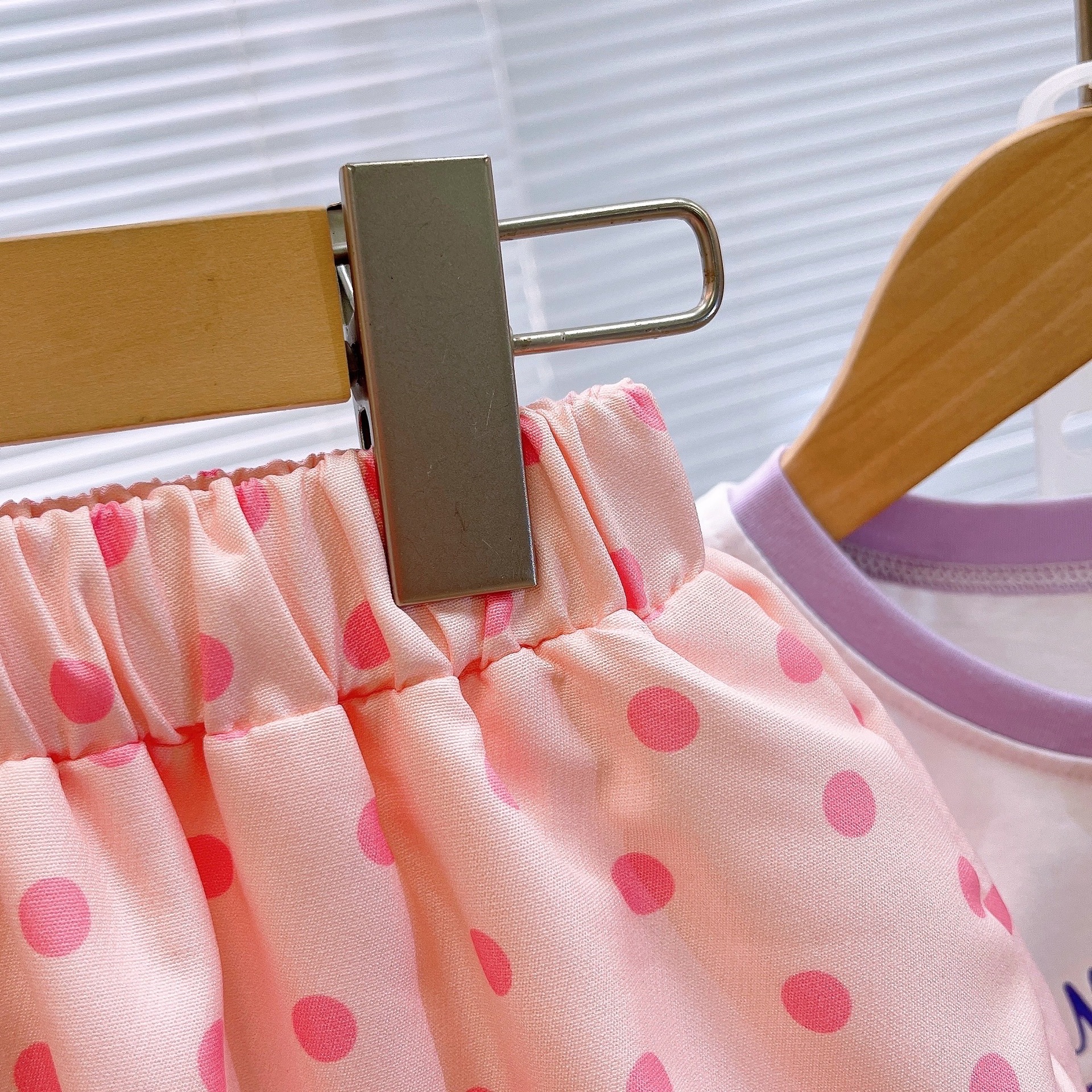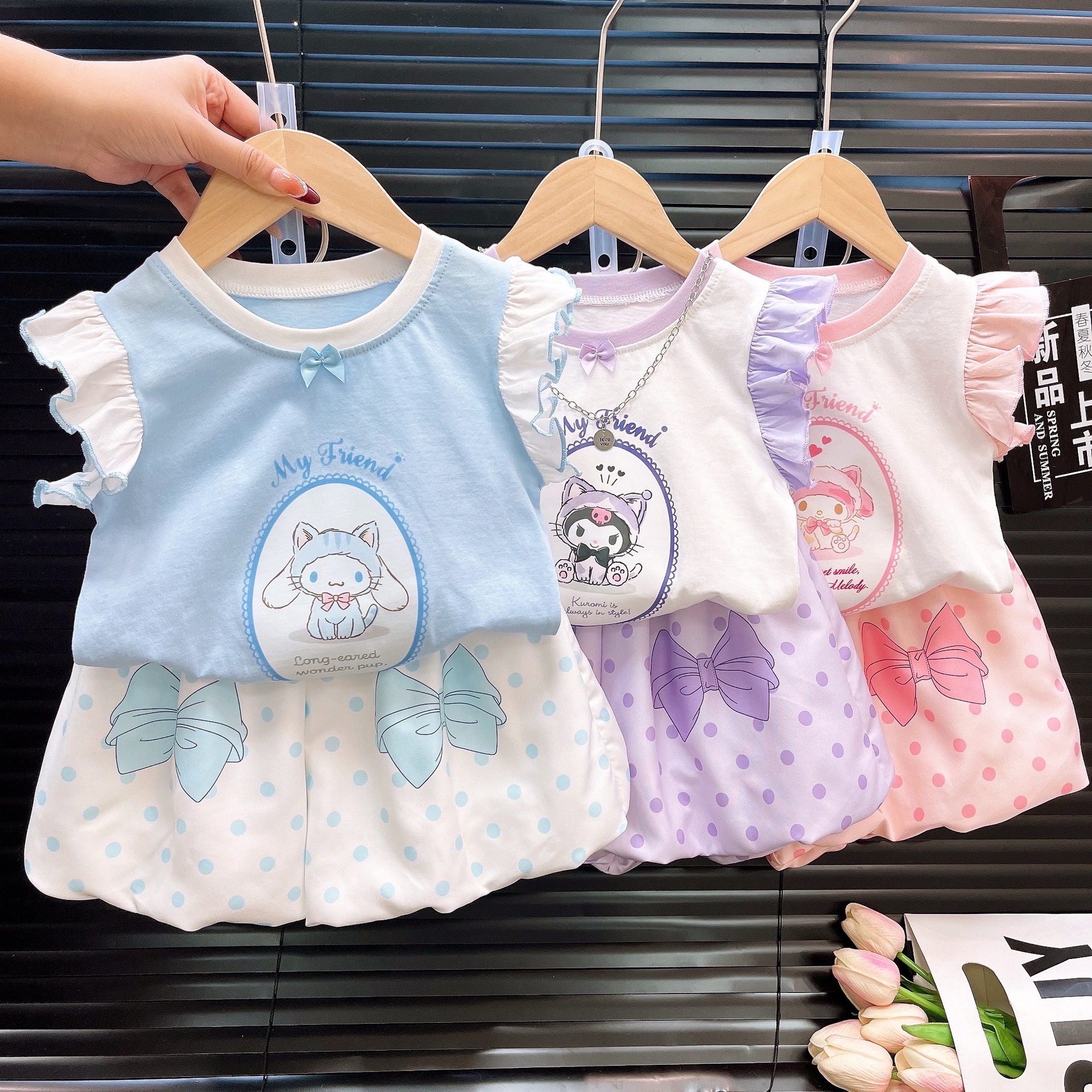 2025 여름 어린이 의류 새로운 소녀 귀여운 세트 폴카 도트 블루머 만화 호박 바지 조끼 세트 패션스토어 가기