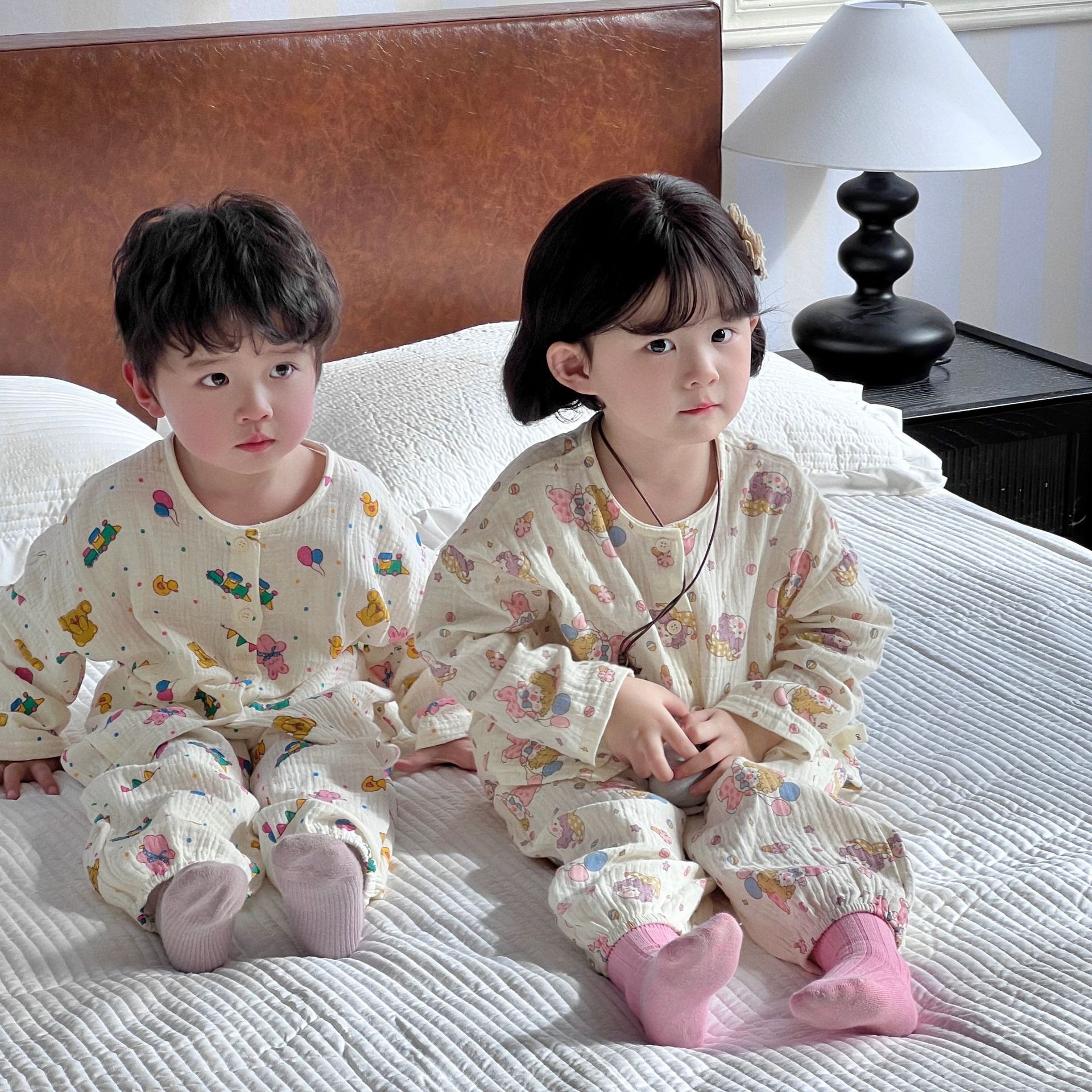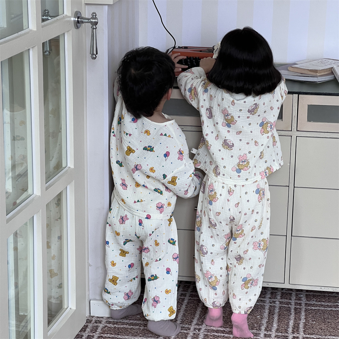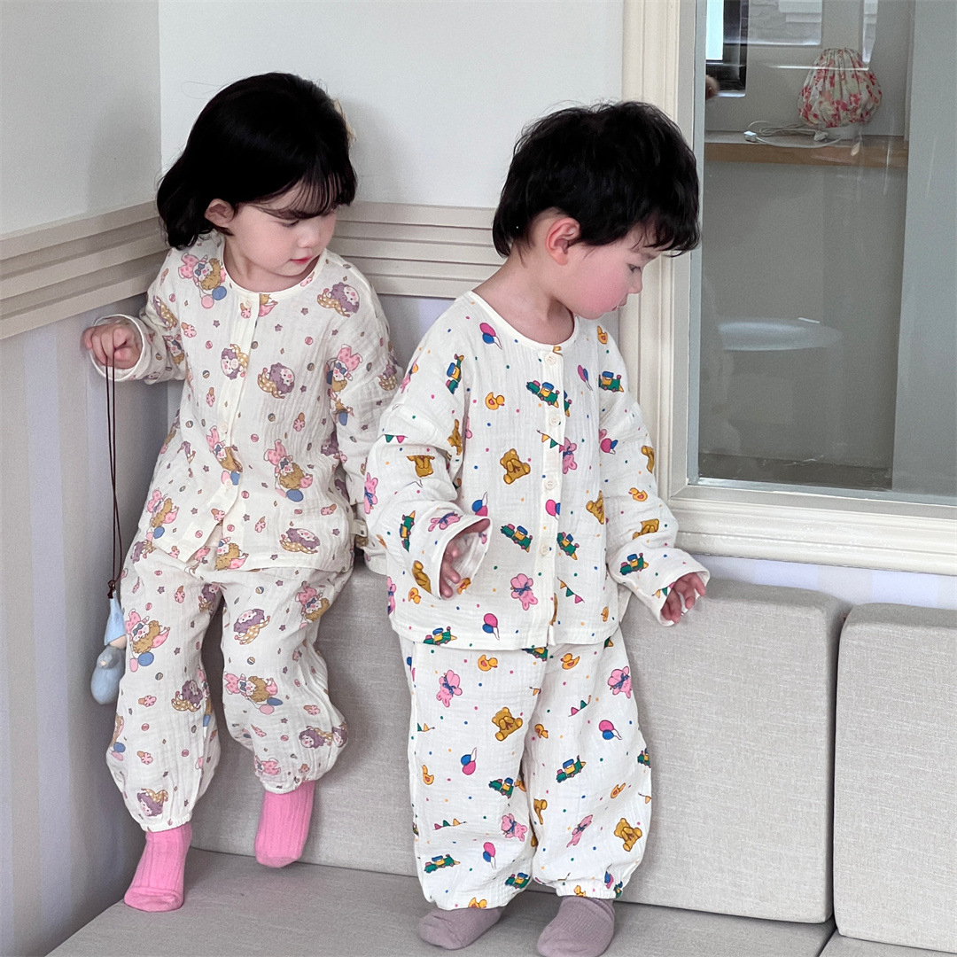 봄 어린이 홈 착용 긴팔 얇은 면 인쇄 둥근 목 캐주얼 만화 통기성 바지 투피스 세트스토어 가기