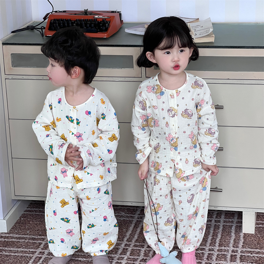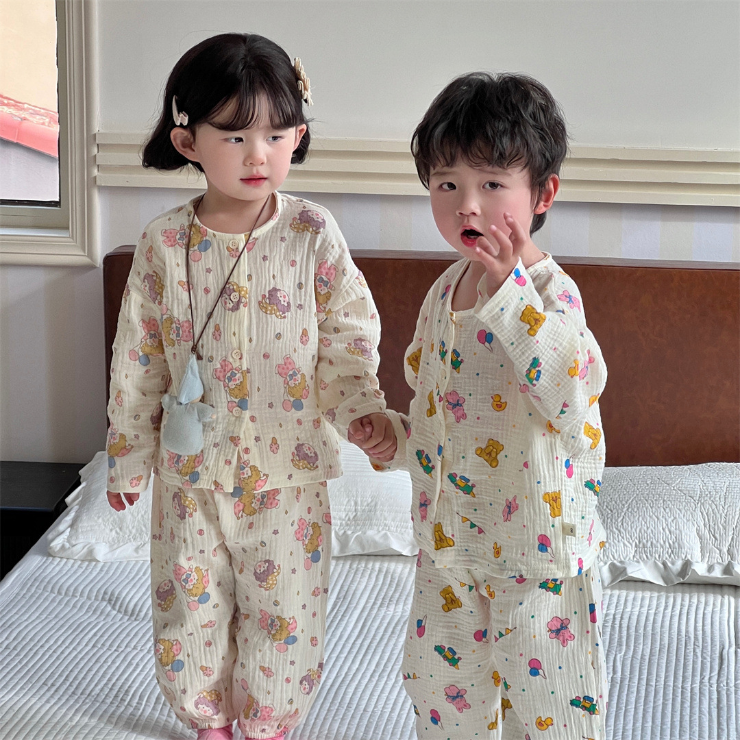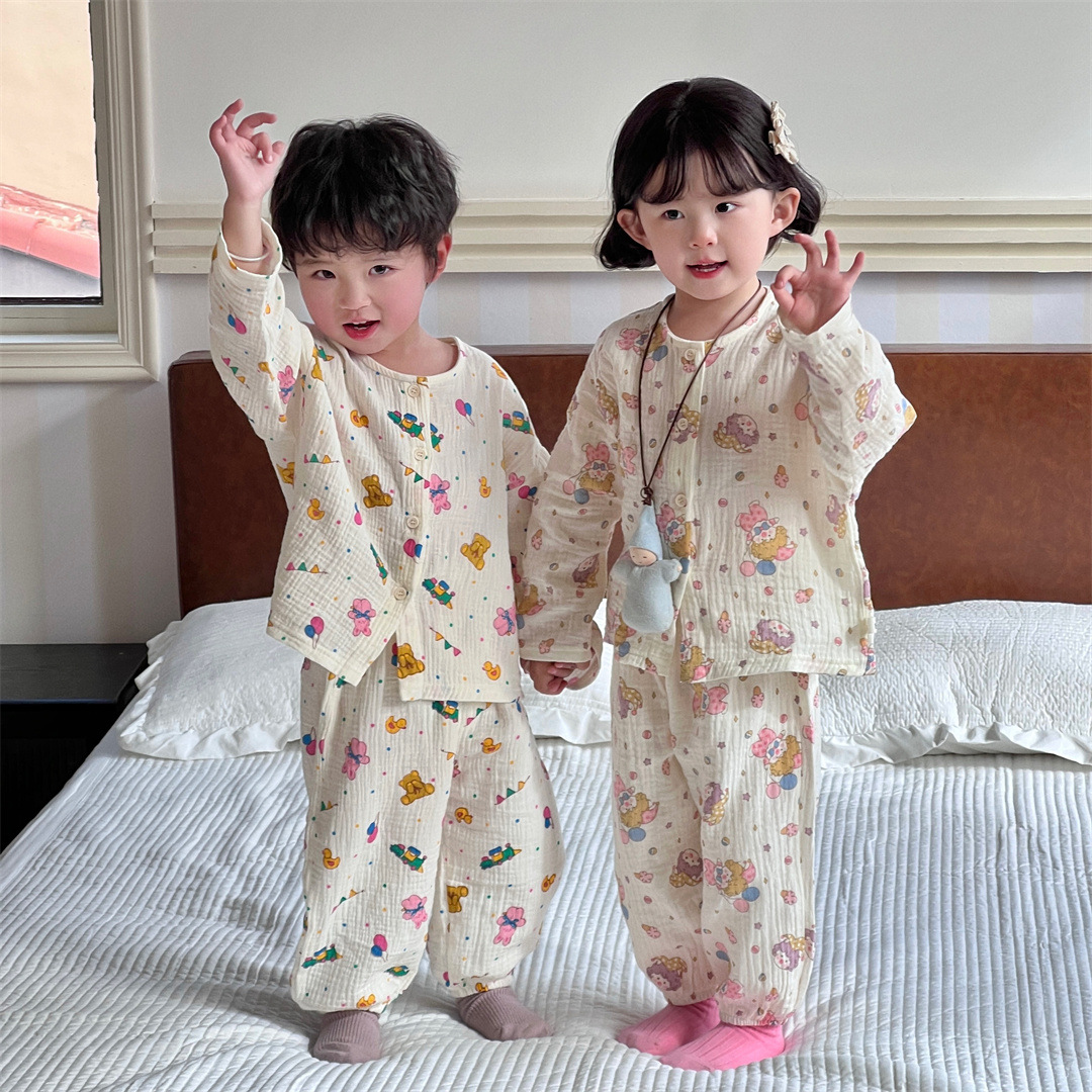 봄 어린이 홈 착용 긴팔 얇은 면 인쇄 둥근 목 캐주얼 만화 통기성 바지 투피스 세트스토어 가기