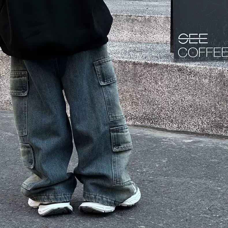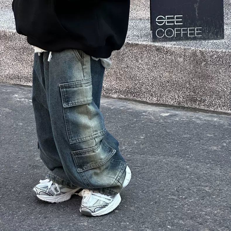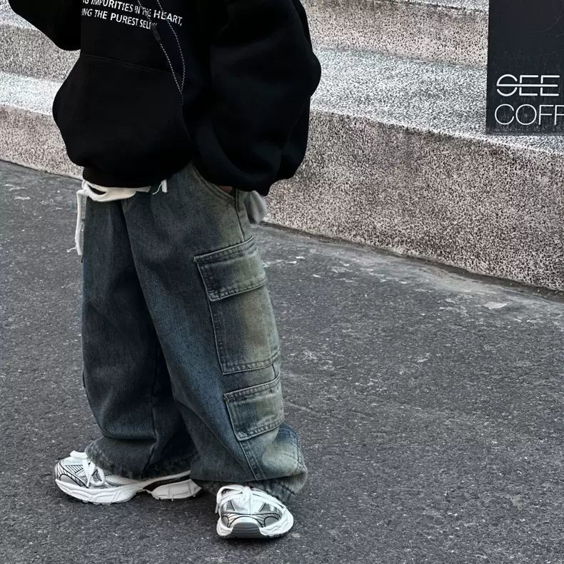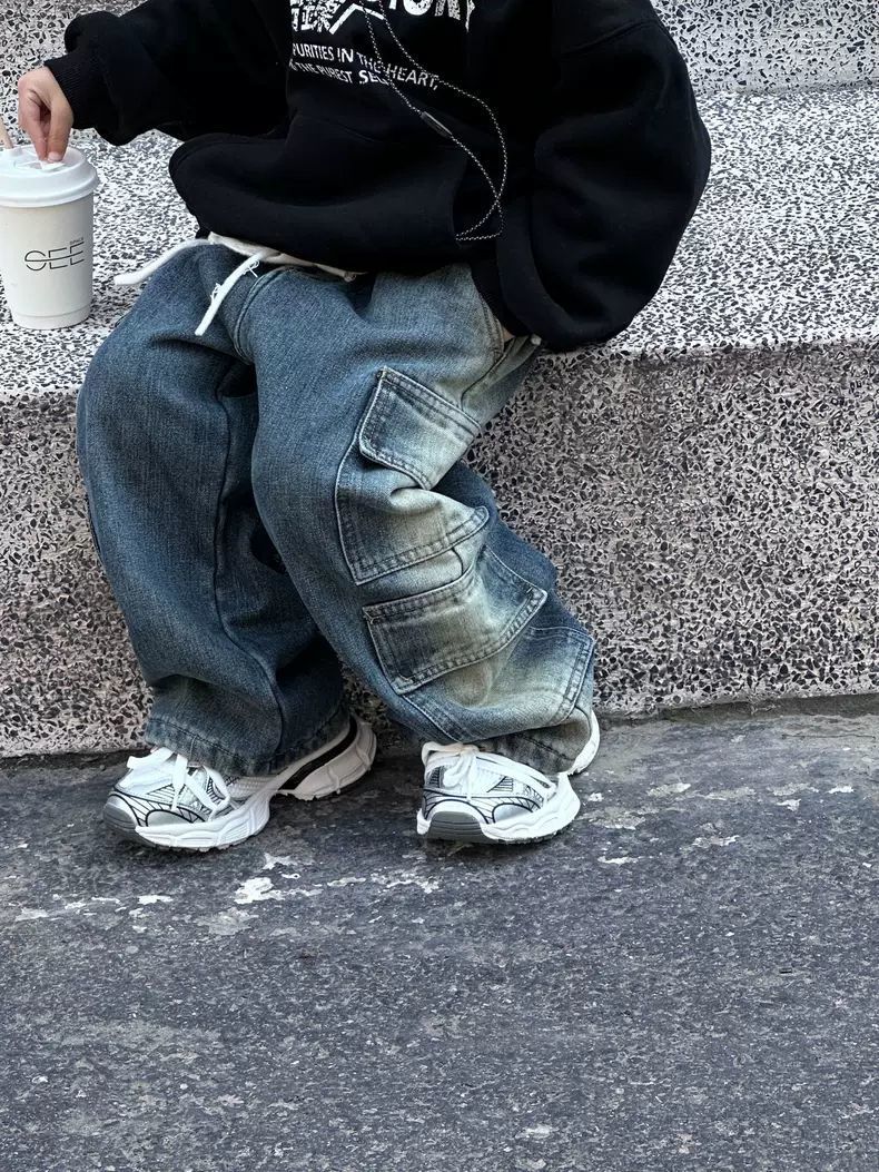 아동용 청바지 봄 가을 남녀 아동용 와이드 팬츠 스트레이트 팬츠 롱 팬츠 워크웨어 스타일 레트로 스타일스토어 가기