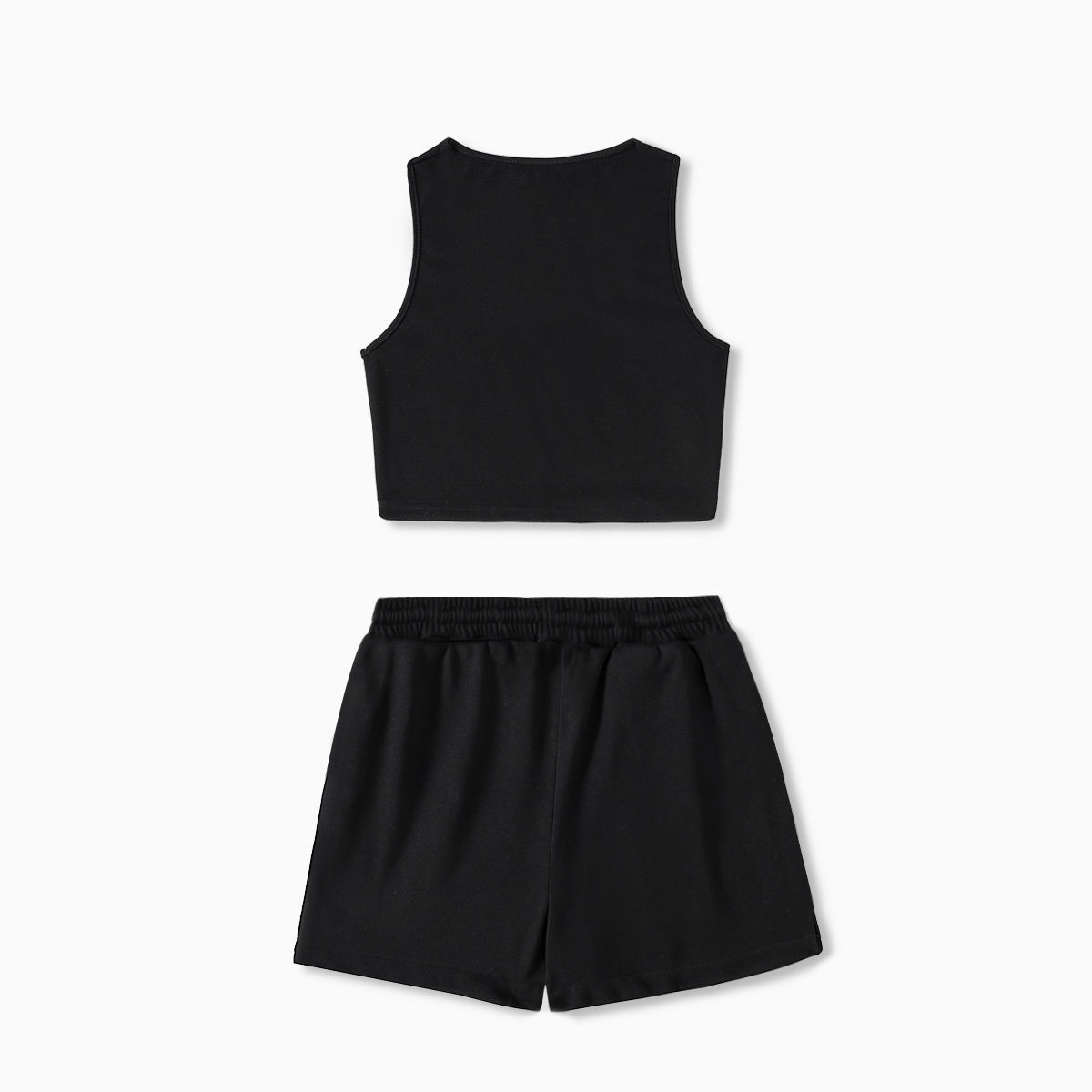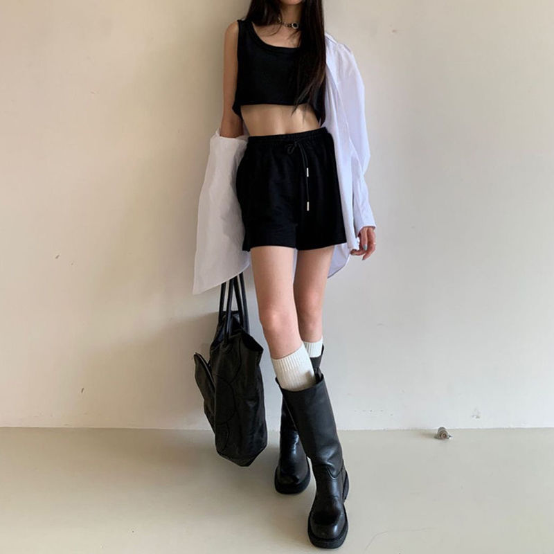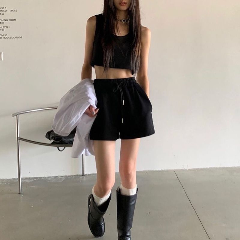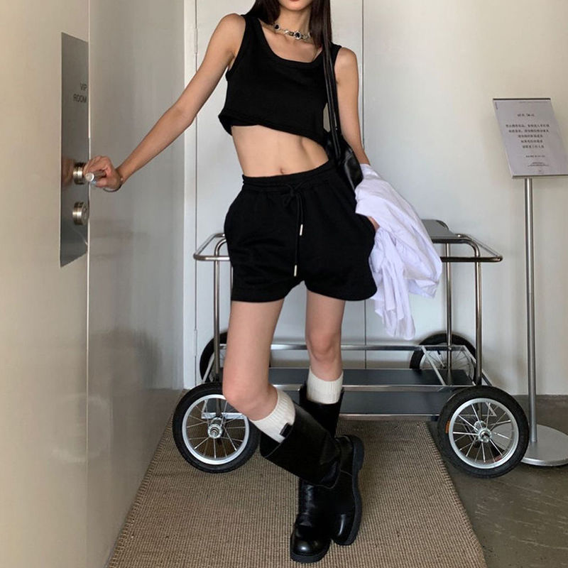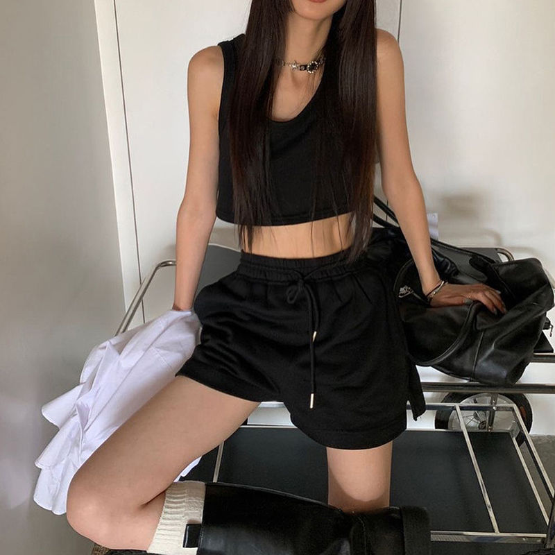 여름 Ins 스타일 스파이스 소녀 슬림 핏 슬리밍 민소매 짧은 배꼽 조끼 블랙 짧은 스포츠 캐주얼 투피스 세트스토어 가기