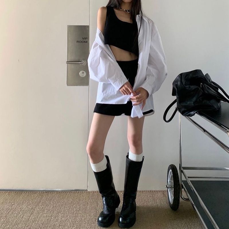여름 Ins 스타일 스파이스 소녀 슬림 핏 슬리밍 민소매 짧은 배꼽 조끼 블랙 짧은 스포츠 캐주얼 투피스 세트