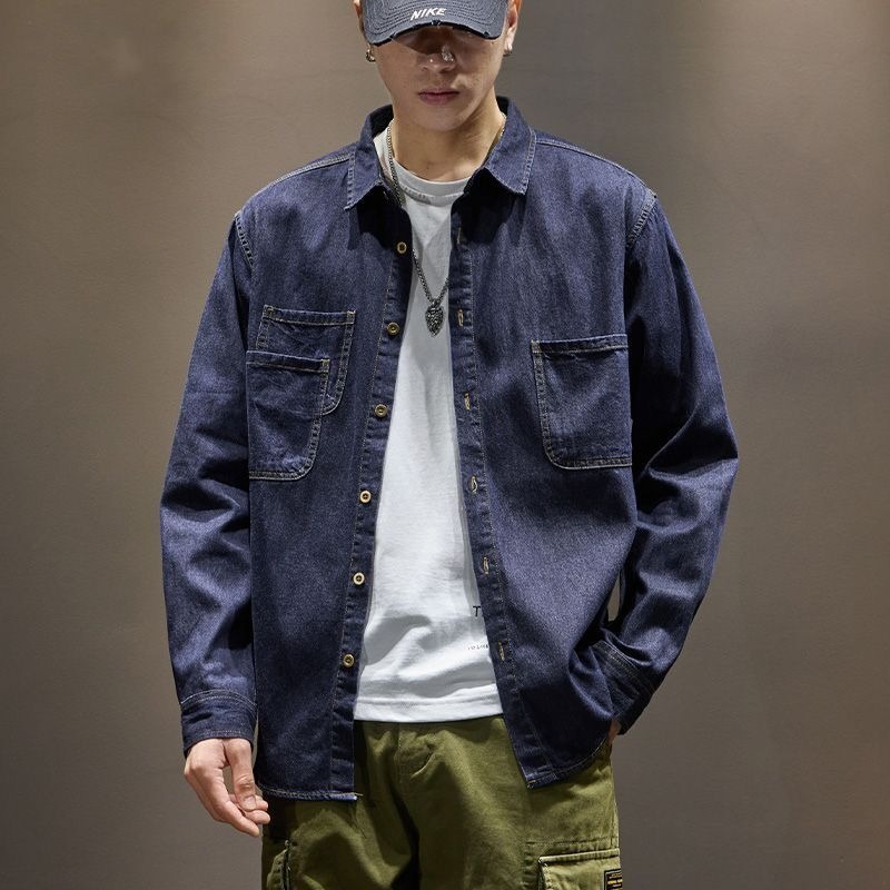 봄과 가을 씻은 데님 셔츠 남자 아메리칸 스타일 레트로 캐주얼 한국 스타일 작업복 루즈 한 더피 안 핸섬 올 매치 셔츠