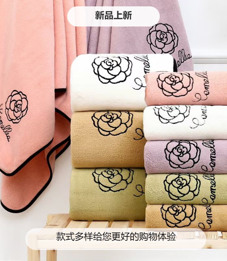 신제품 출시, 걸 수 있는 산호섬유 동백꽃 타월, 목욕타월, 보풀이 잘 안나고 부드러운 촉감, 색이 바래지 않음스토어 가기