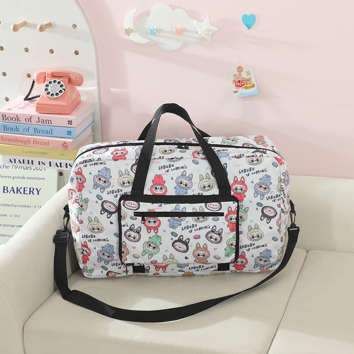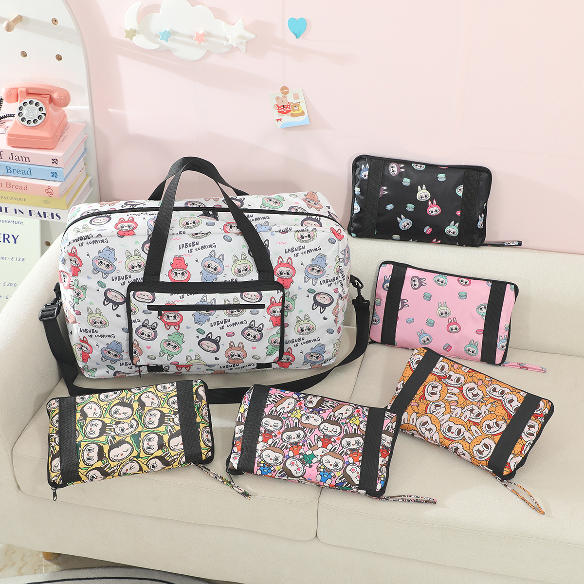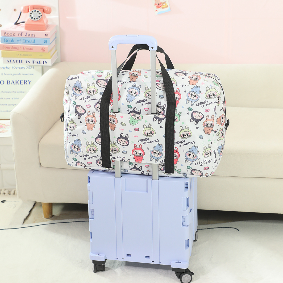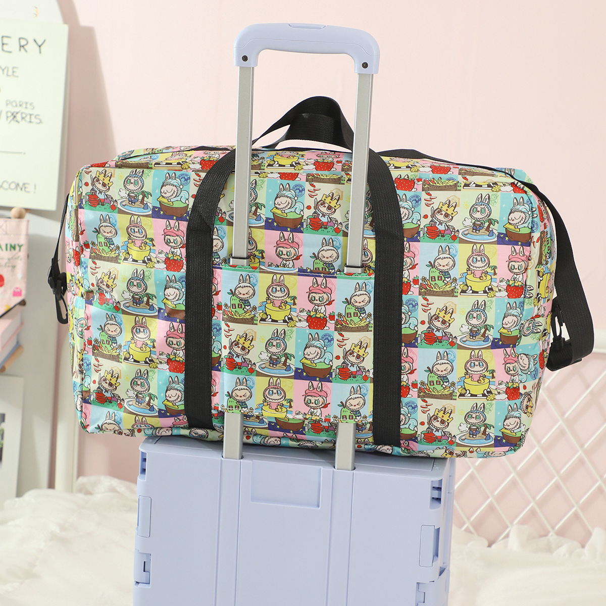 새로운 버블 마트 Labubu 휴대용 접이식 여행 가방 대용량 옥스포드 천 여행 가방 교수형 여행 케이스스토어 가기
