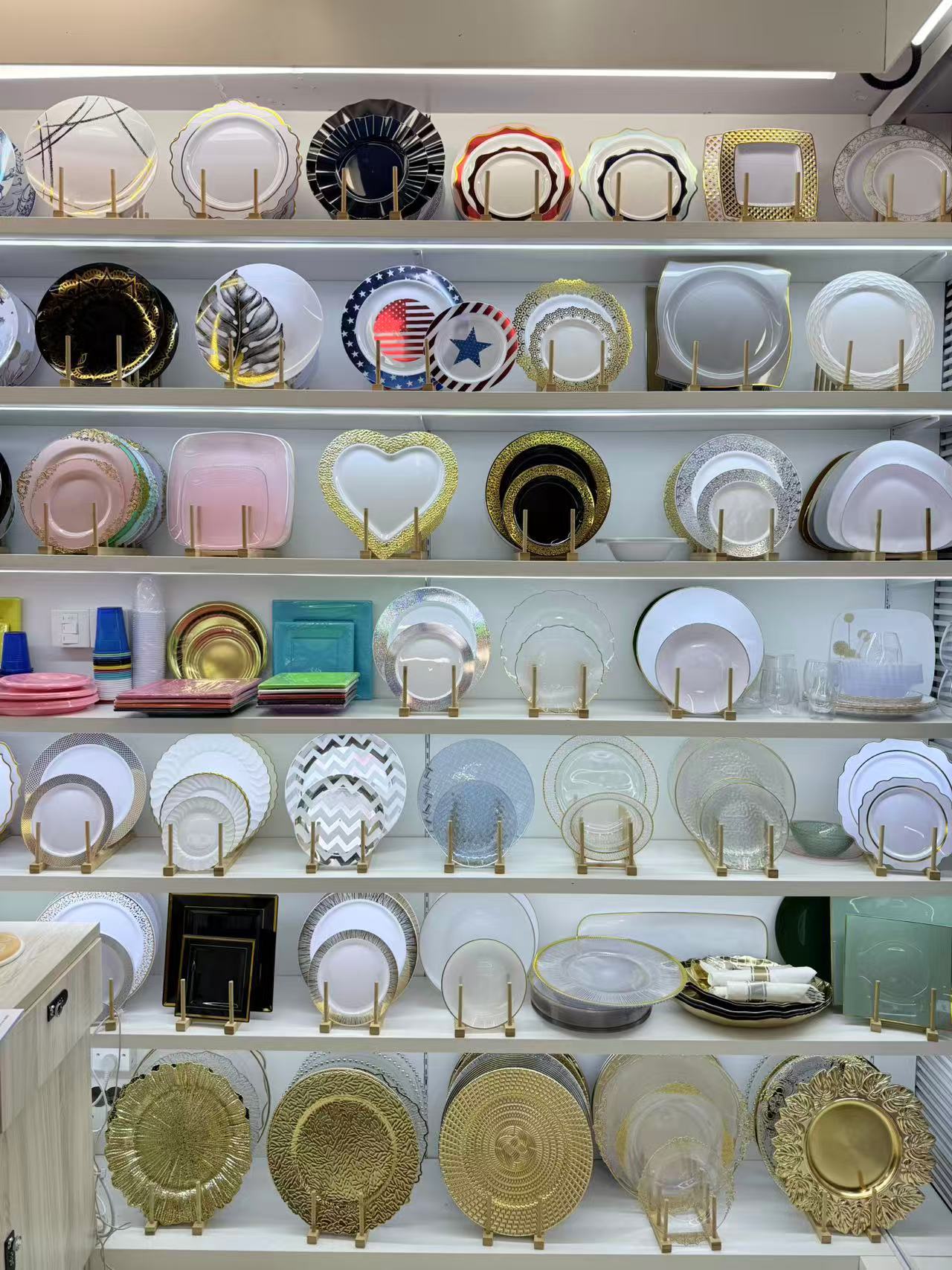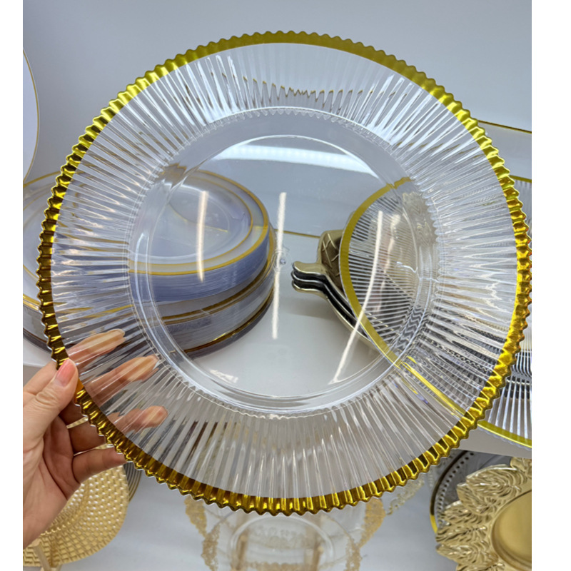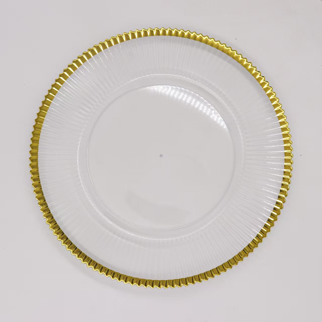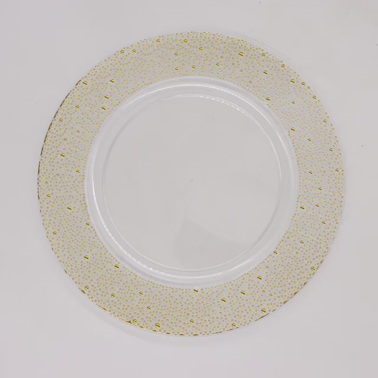 공장 직접 청동 골드 구슬 웨딩 호텔 라운드 구슬 플레이트 투명 장식 플라스틱 플레이트 충전기 플레이트스토어 가기