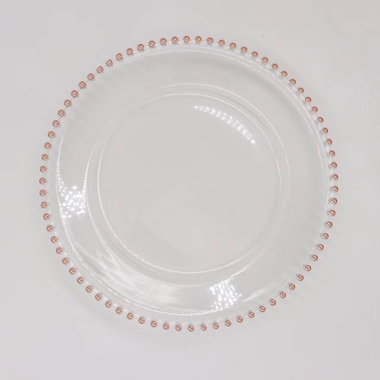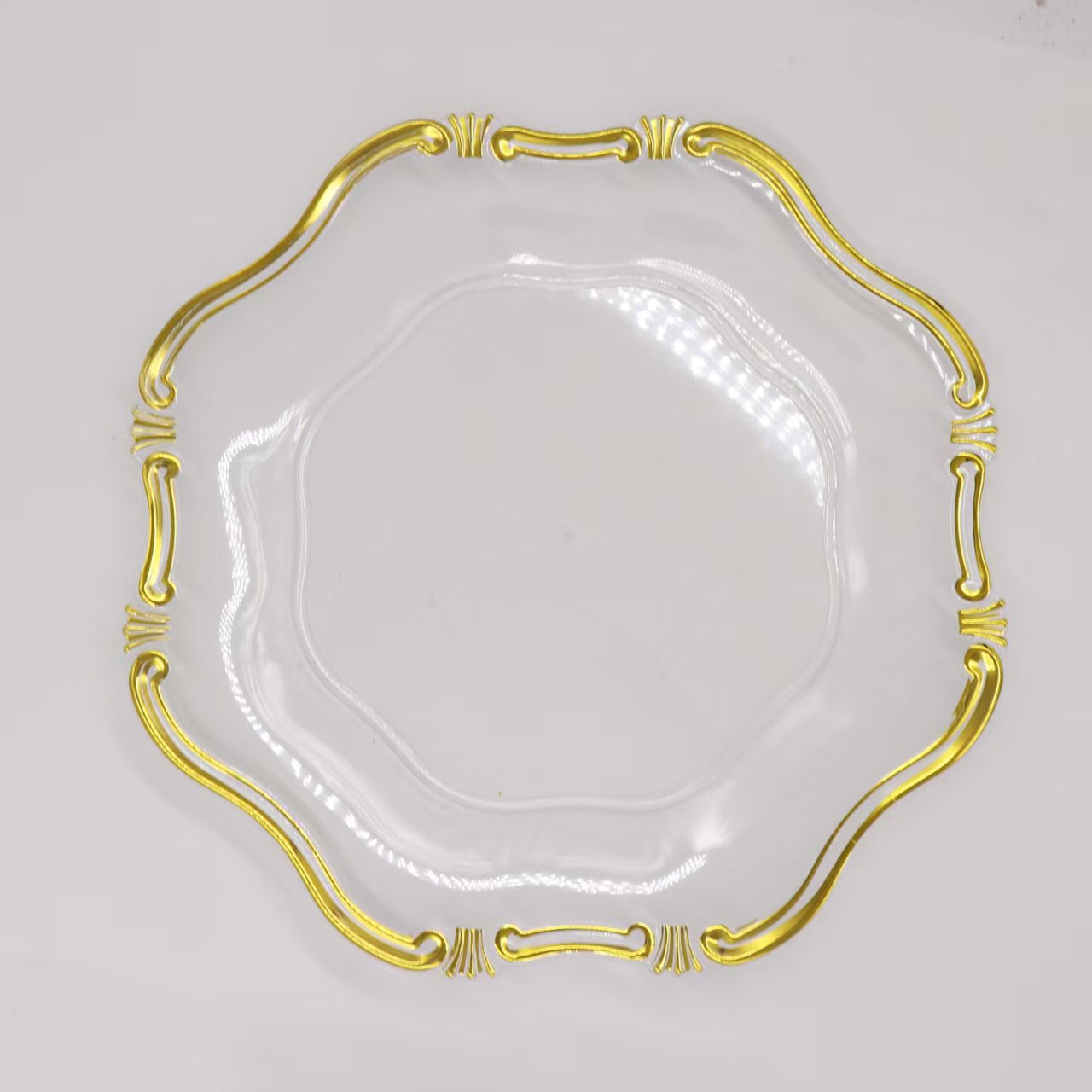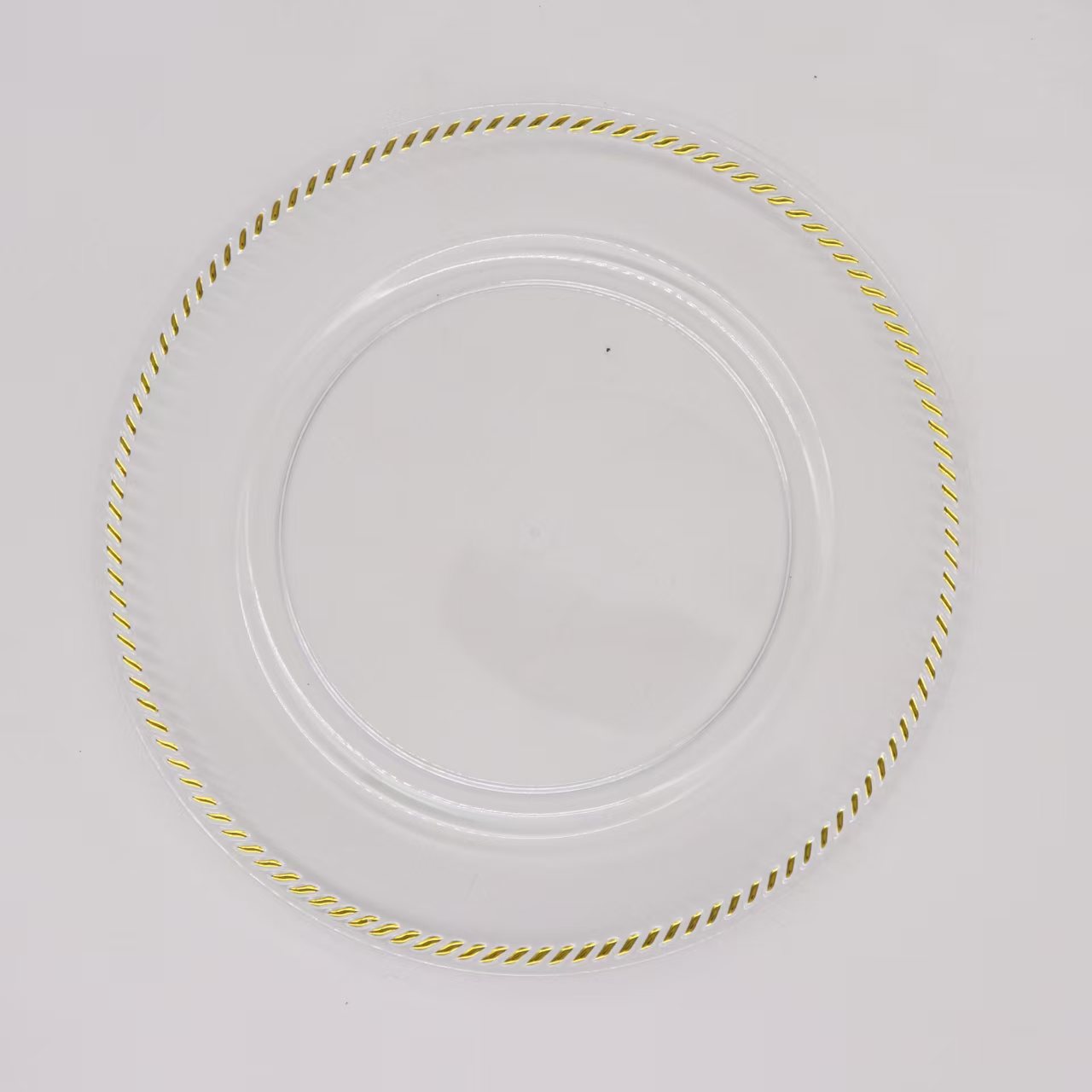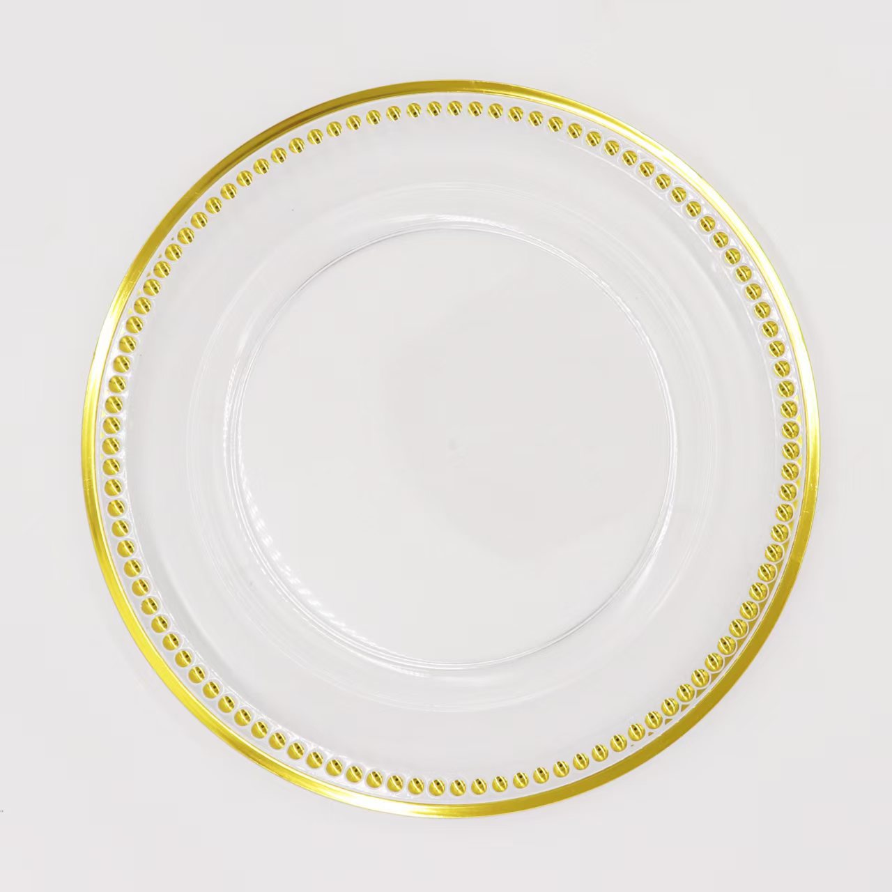 공장 직접 청동 골드 구슬 웨딩 호텔 라운드 구슬 플레이트 투명 장식 플라스틱 플레이트 충전기 플레이트