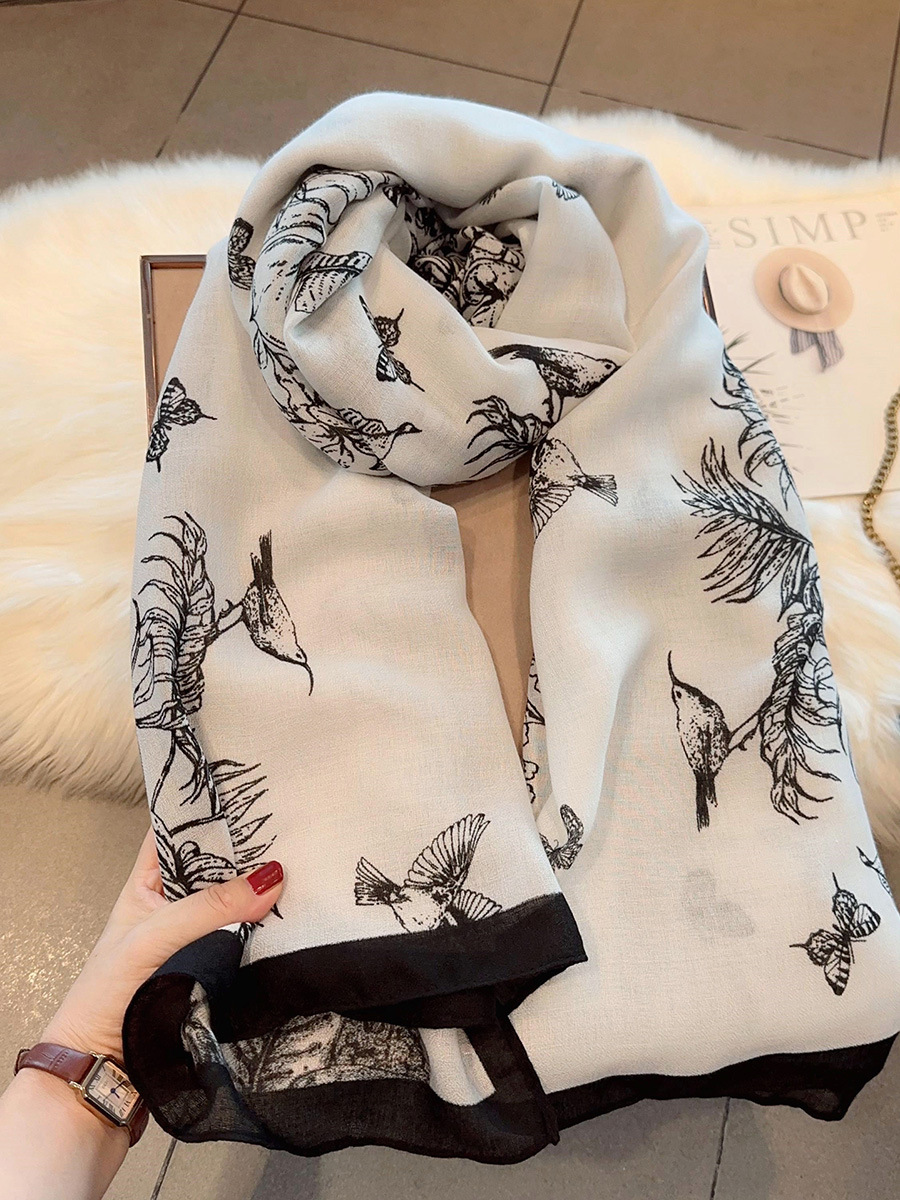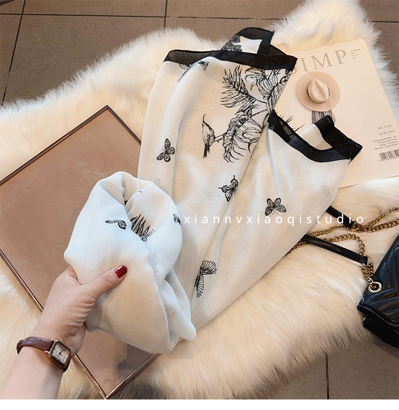黑白蝴蝶简约素描棉麻围巾女国风时尚披肩保暖围脖秋冬长款丝巾薄