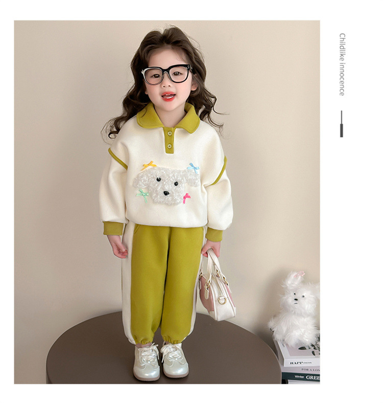 소녀 귀여운 강아지 세트 봄과 가을 2025 새로운 패션 작은 소녀 폴로 셔츠 후드 캐주얼 투피스 세트