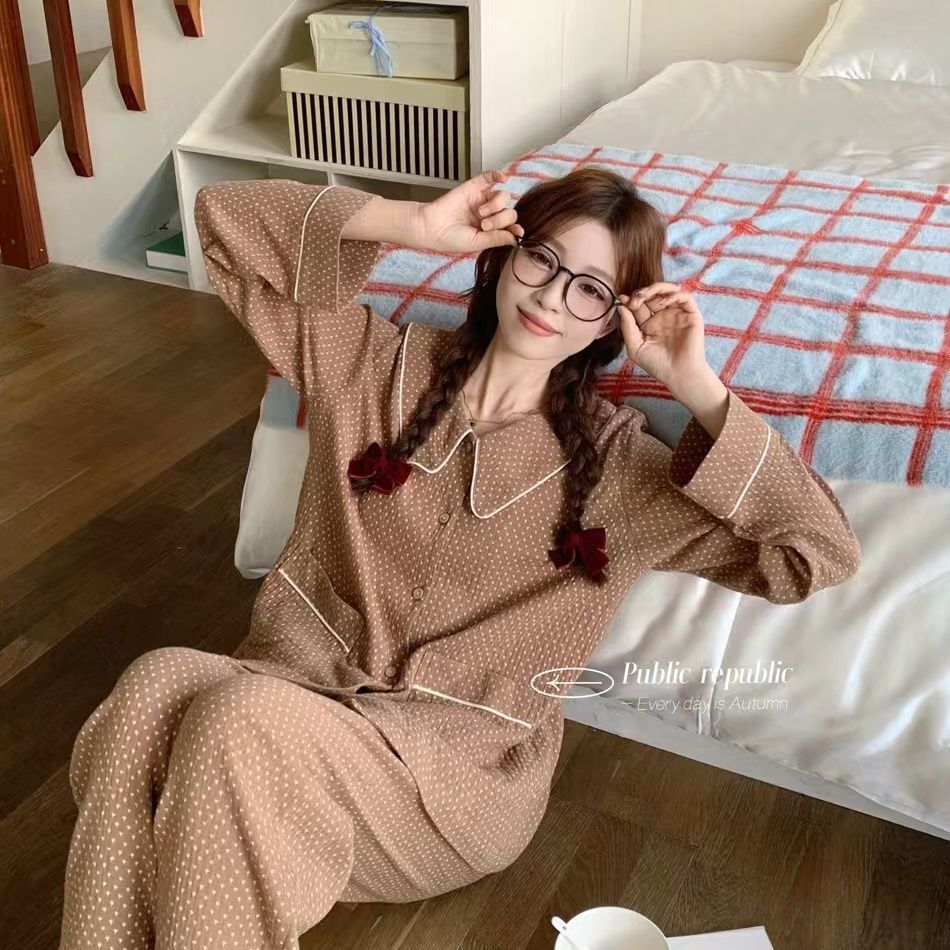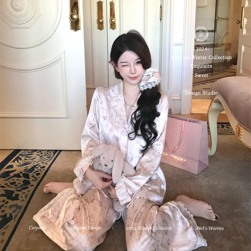 귀여운 레이스 테디 파자마 여성의 봄과 가을 새로운 도착 줄무늬 긴팔 바지 일본 학생 홈 의류 세트 외부 착용