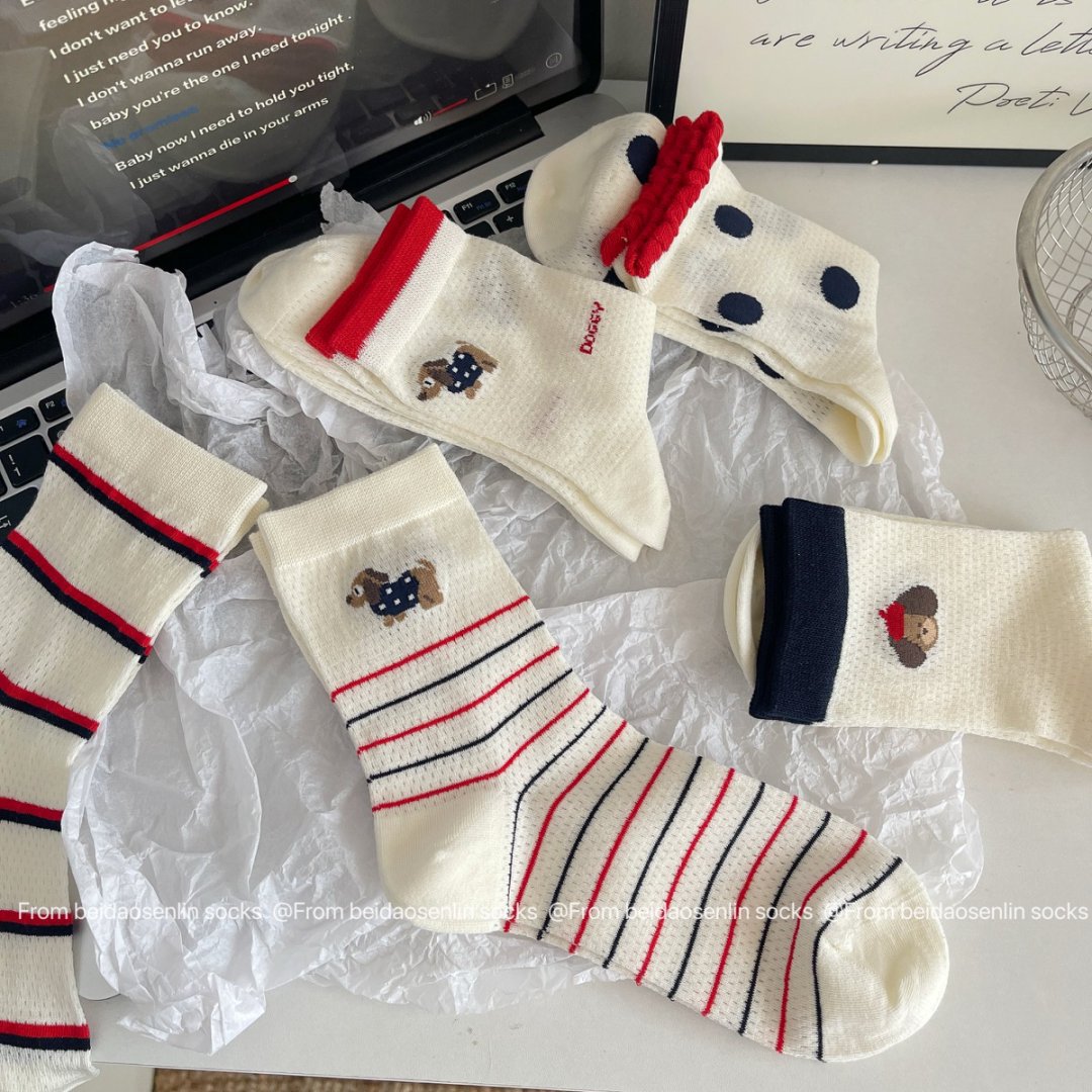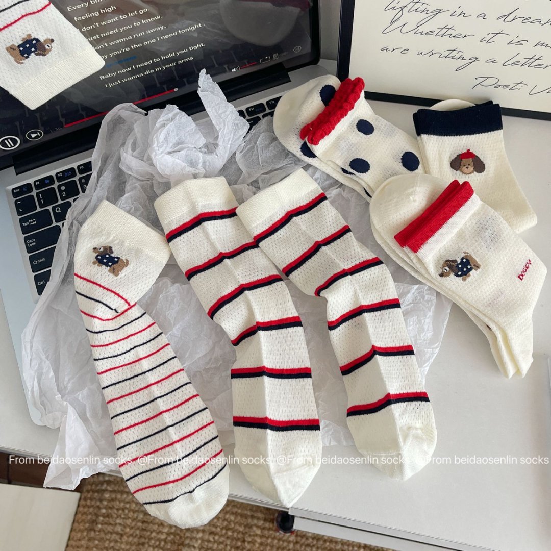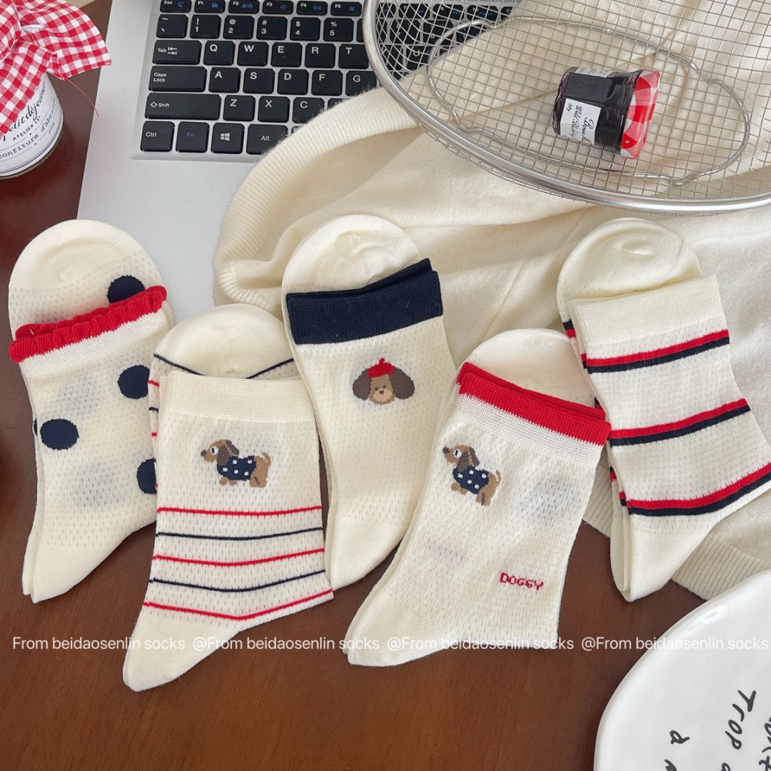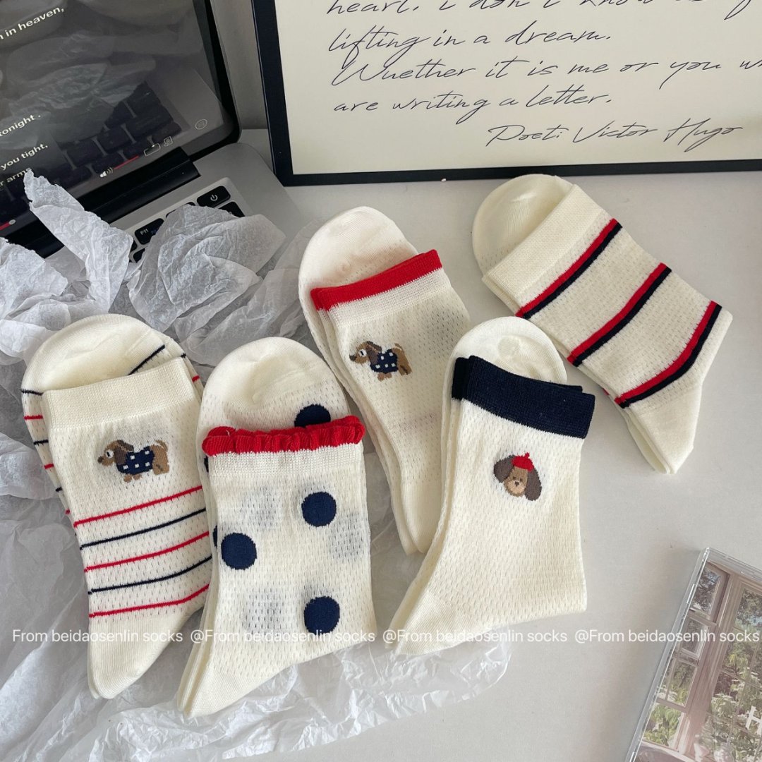 Mekki 새로운 여성 양말 스트라이프 메쉬 폴카 도트 양말 개 만화 중반 송아지 양말 가볍고 통기성 기능 유행면 양말스토어 가기