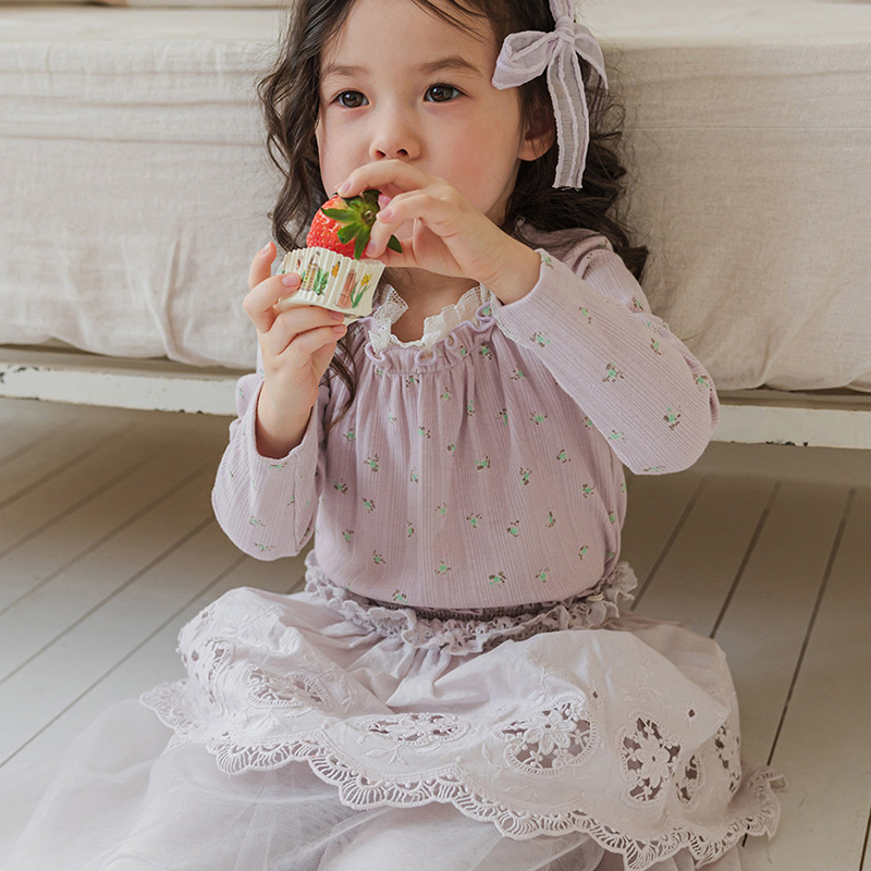 2025 가을 딸기 샤넌 한국 어린이 소녀 면 부드럽고 편안한 꽃무늬 레이스 스퀘어 넥 베이비돌 티셔츠