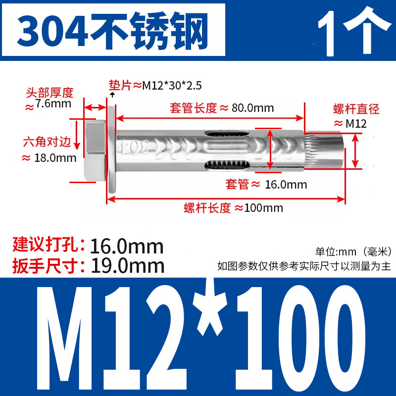 • M12*100 [304 스테인레스 스틸-1개] 드릴링은 16mm입니다.