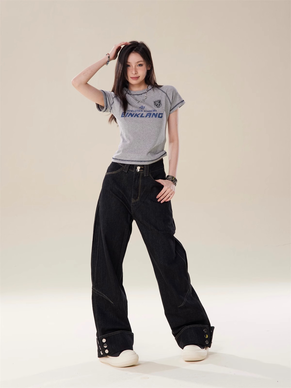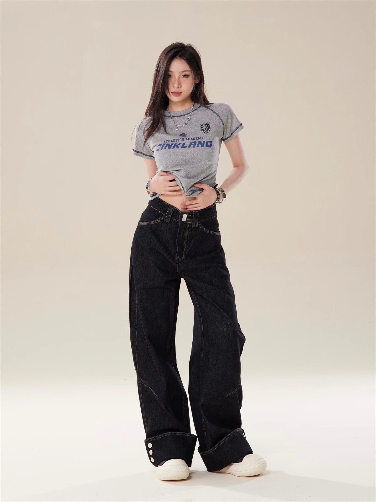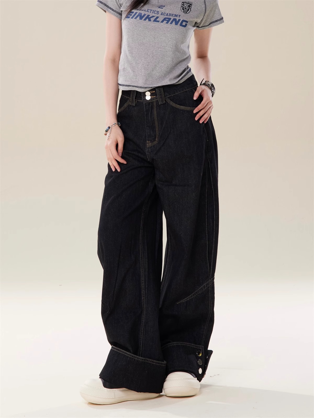 미국식 블랙 헤비듀티 밑단 컷팅 와이드 레그 청바지 여성용 디자인 하이웨이스트 롱 스트레이트 팬츠 고급스러운 드레이프감스토어 가기