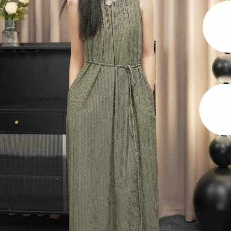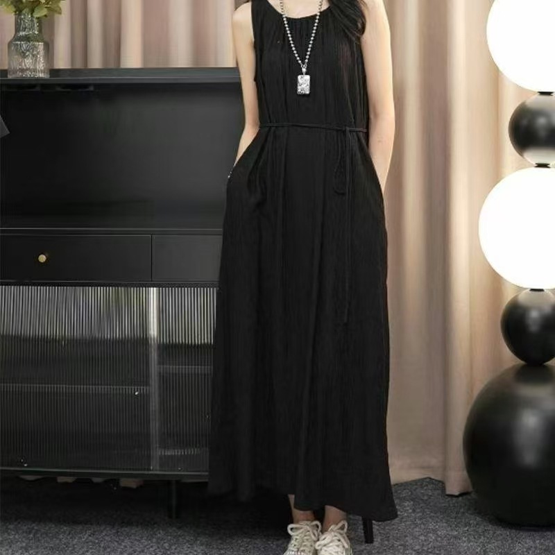 프랑스 스타일 빈티지 포켓 원피스 여성 여름 슬리밍 살을 가리는 세련된 타이트 허리 민소매 올 매치 루즈 플리츠 슬링