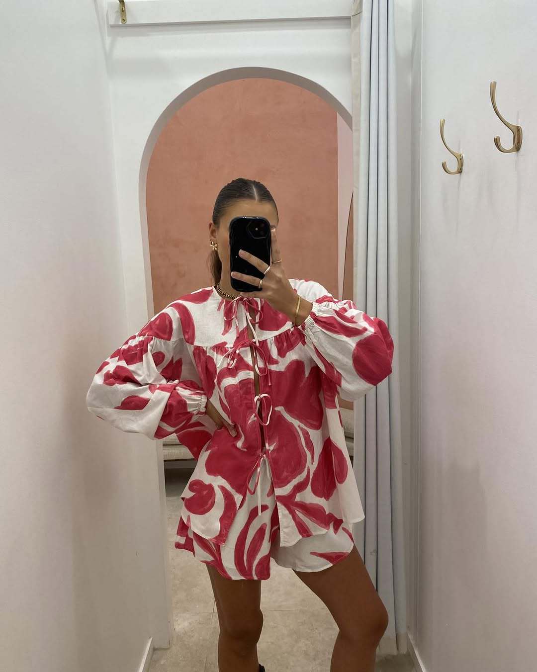 인쇄 된 캐주얼 레이스 업 긴팔 셔츠 반바지 봄 및 여름 세트 국경 간 대외 무역 느슨한 여성 투피스 세트스토어 가기