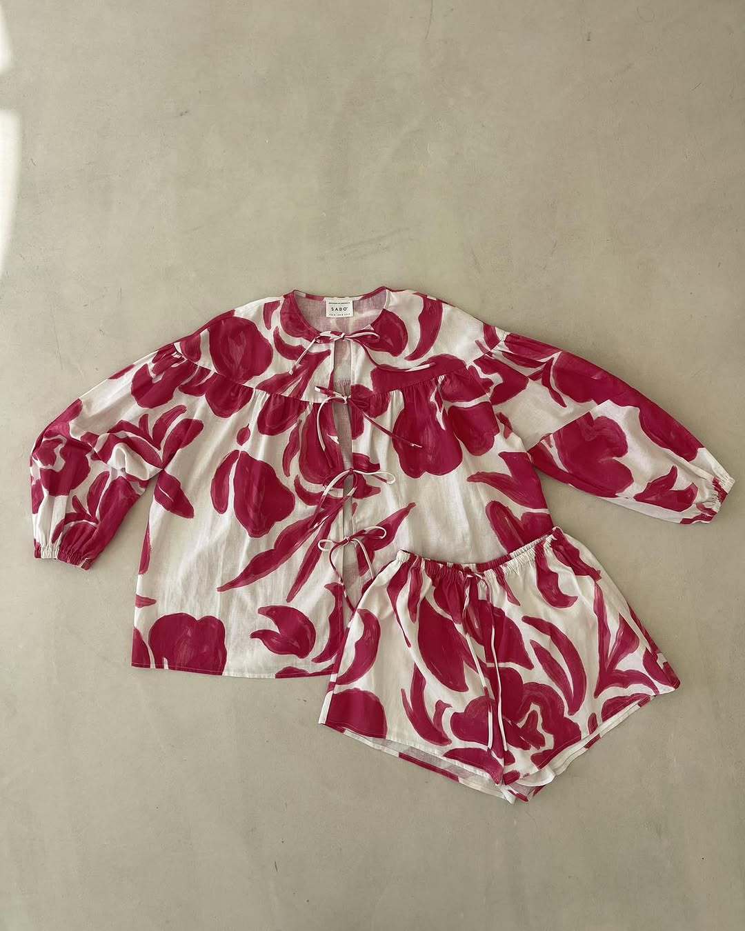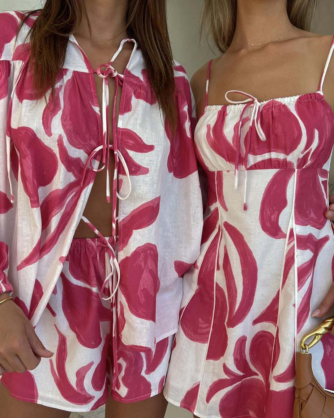 인쇄 된 캐주얼 레이스 업 긴팔 셔츠 반바지 봄 및 여름 세트 국경 간 대외 무역 느슨한 여성 투피스 세트