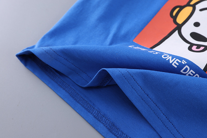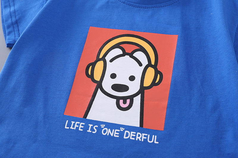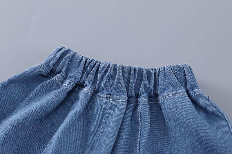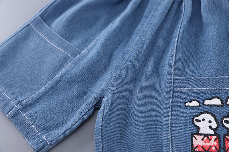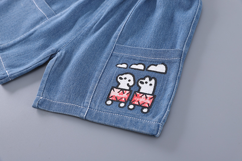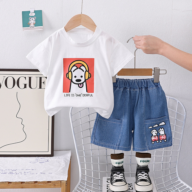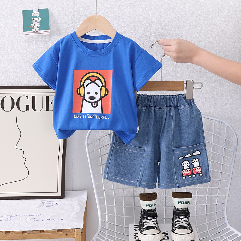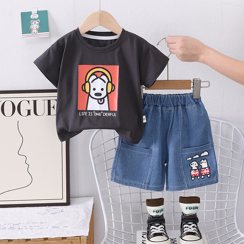 2025 새로운 여름 아동복 소년 짧은 소매 만화 강아지 데님 반바지 두 조각 세트 머리카락