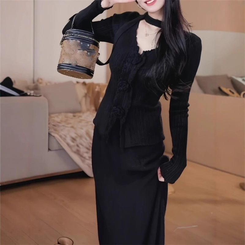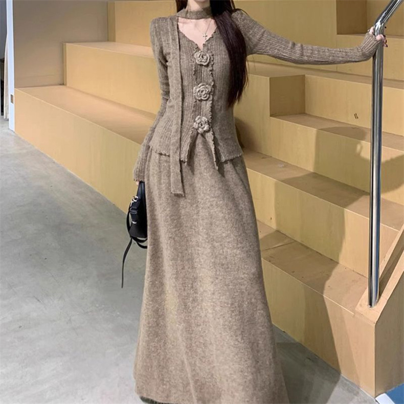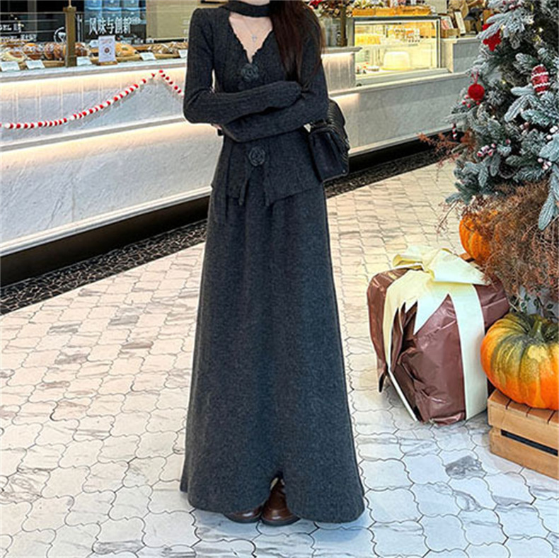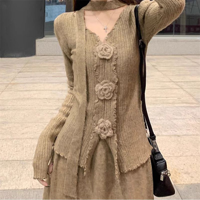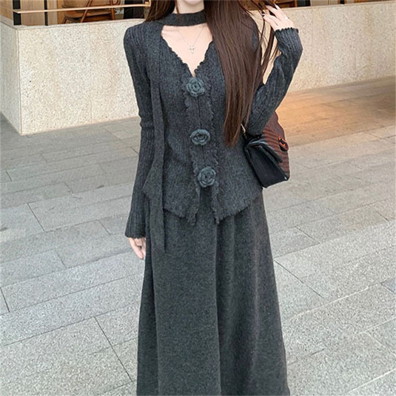 3 차원 꽃 V 넥 리본 니트웨어 하이 허리 슬리밍 하프 길이 원피스 스웨터 여성 2025 봄 패션 세트