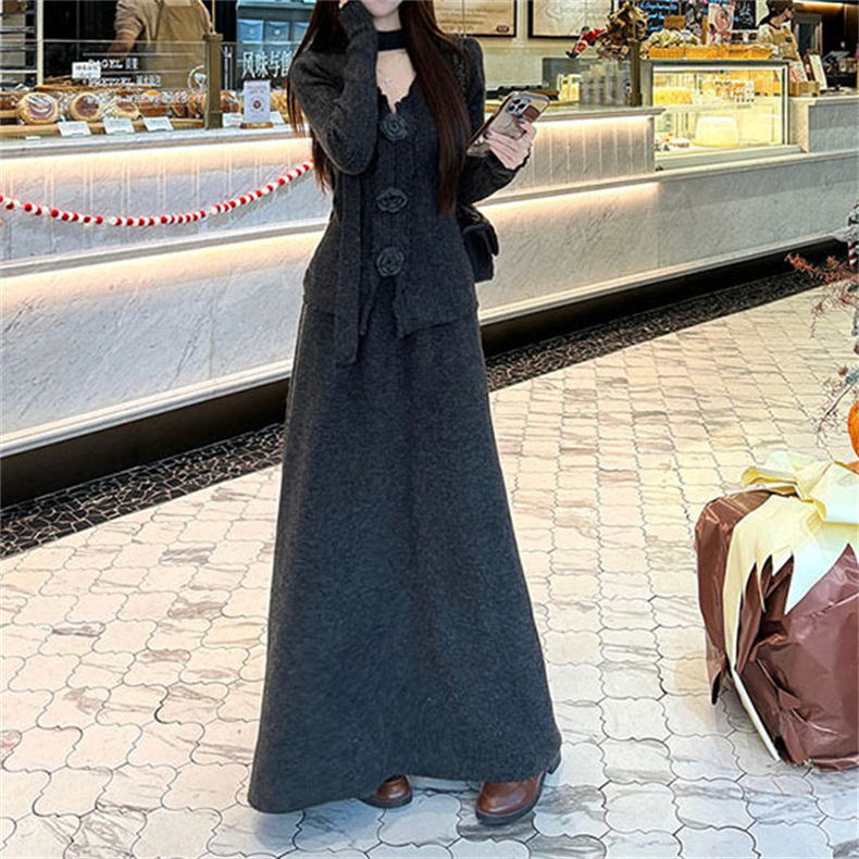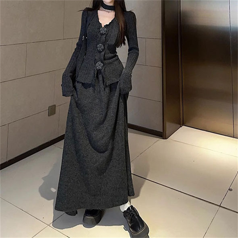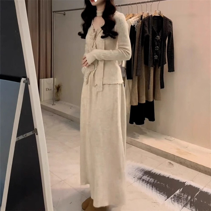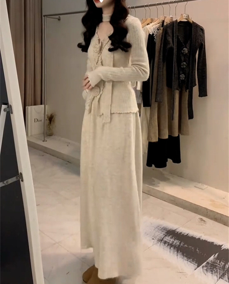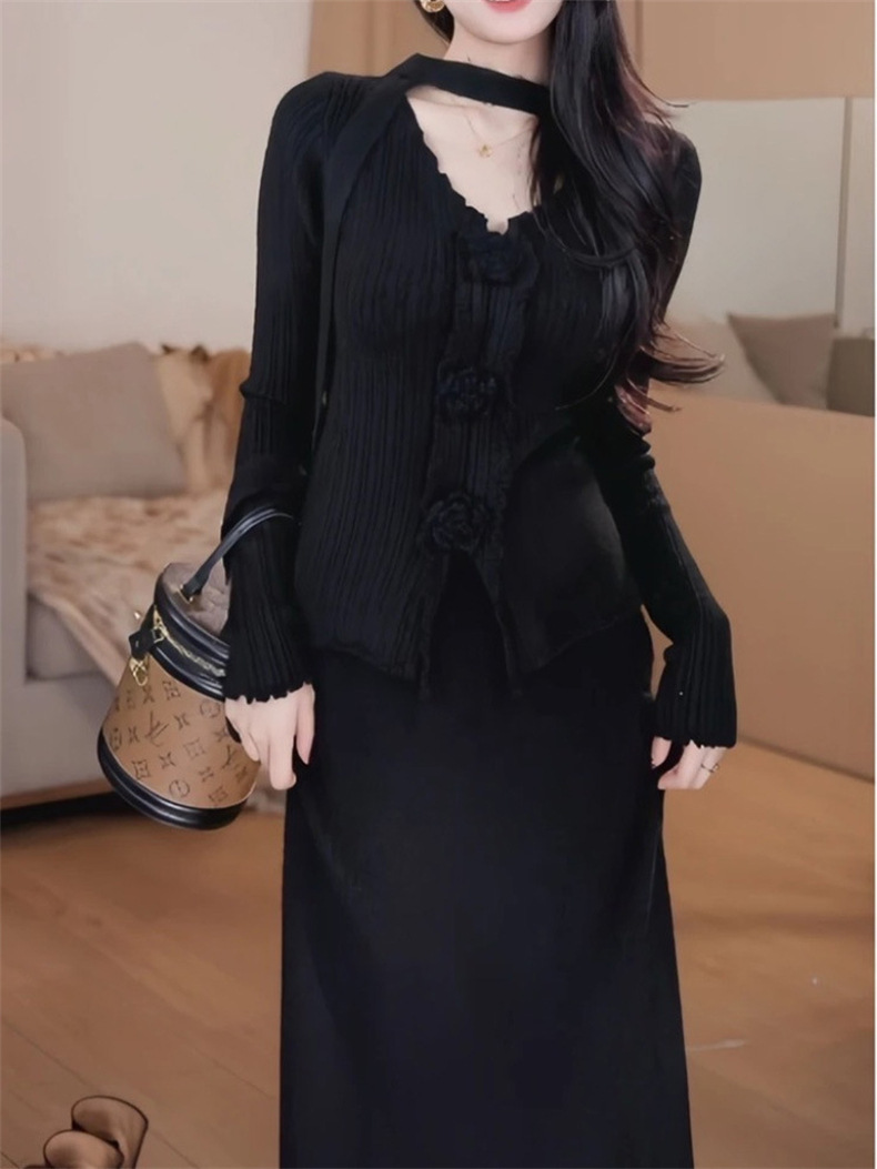 3 차원 꽃 V 넥 리본 니트웨어 하이 허리 슬리밍 하프 길이 원피스 스웨터 여성 2025 봄 패션 세트