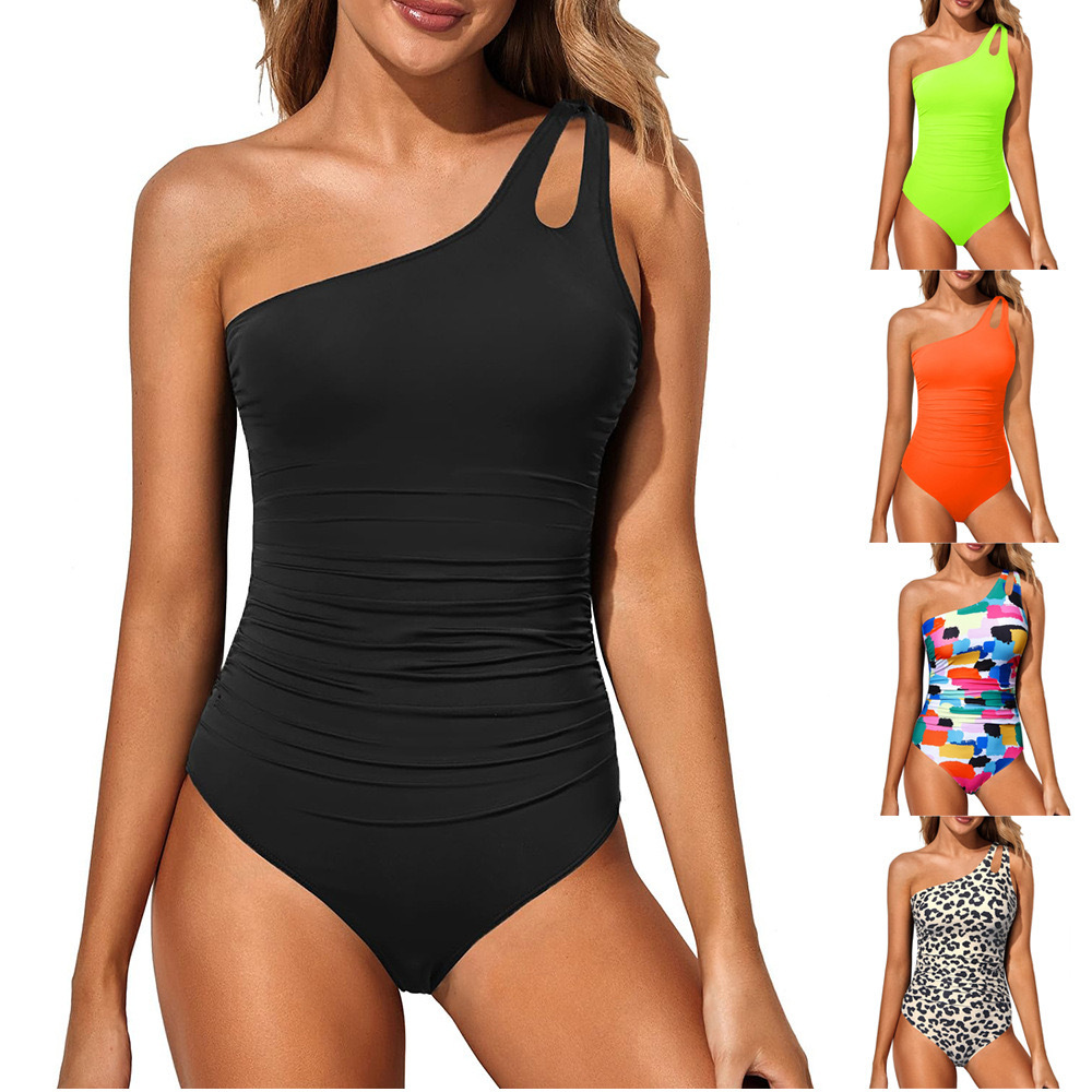 2025 새로운 대외 무역 유럽과 미국의 원피스 수영복 여성 비스듬한 어깨 빈 보수 레오파드 무늬 원피스 수영복 아마존스토어 가기