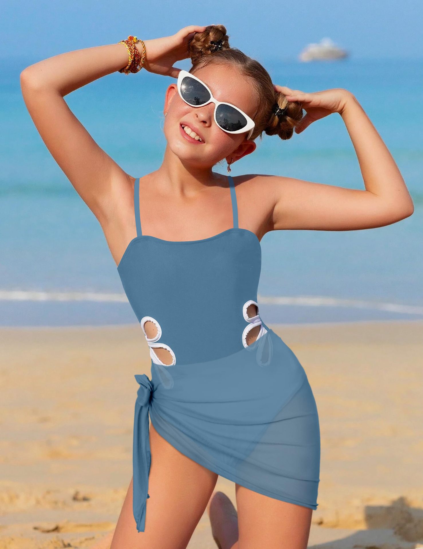2025 새로운 아마존 컬러 콘트라스트 플라워 할로우 아웃 걸의 원피스 수영복 스커트 크로스 보더 소녀의 수영복 수영복스토어 가기