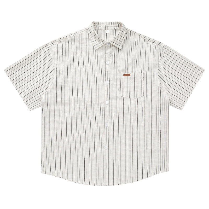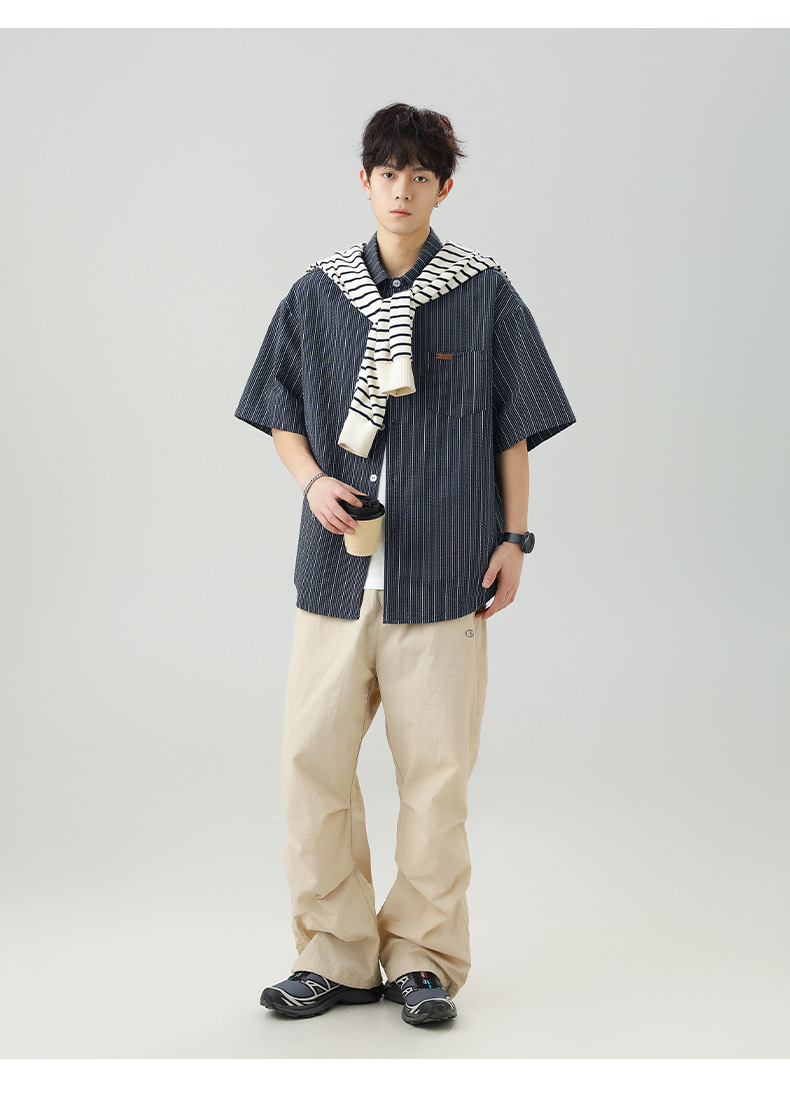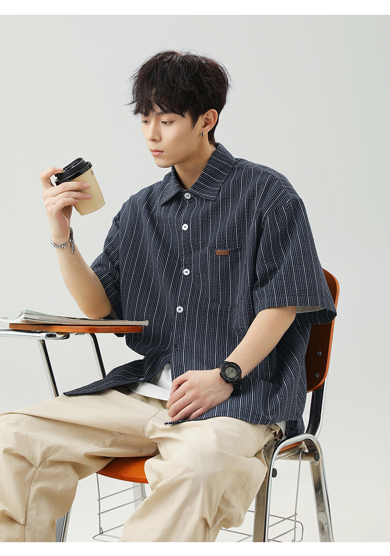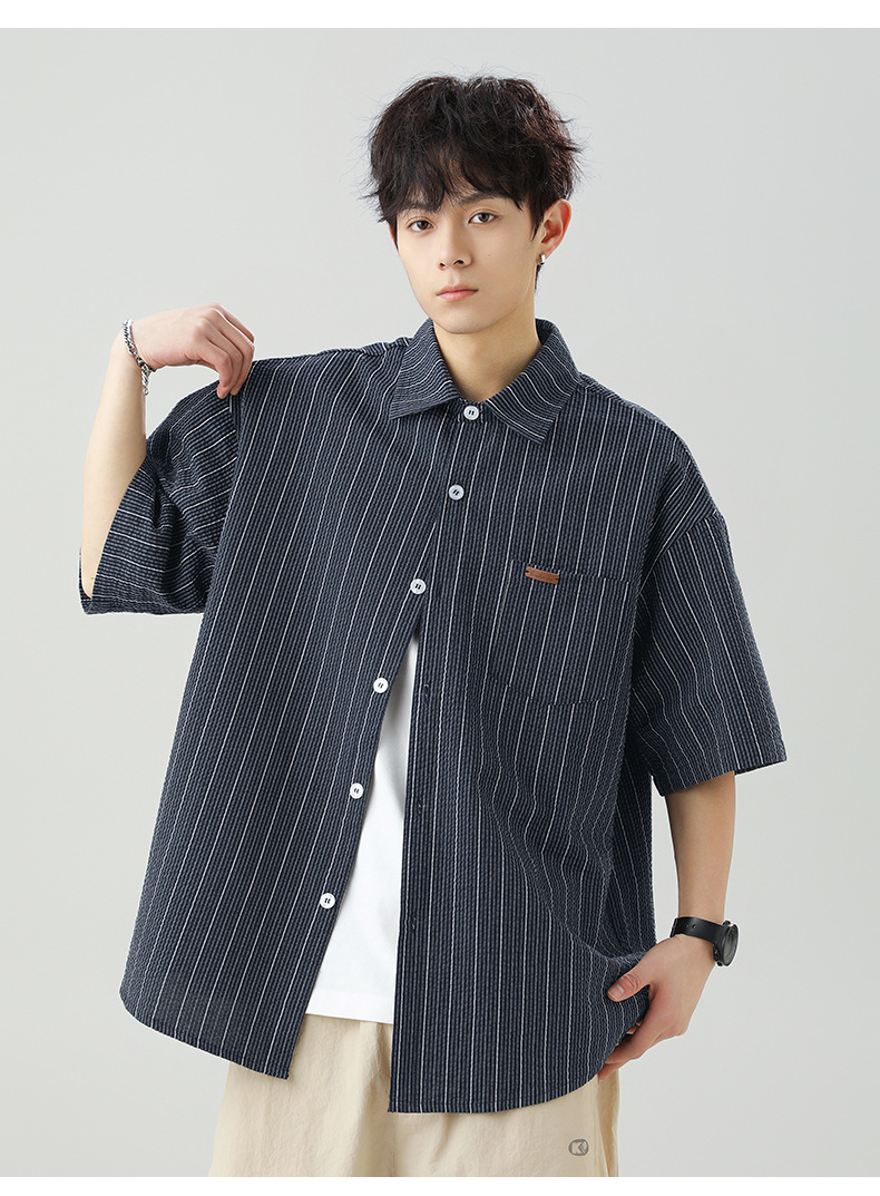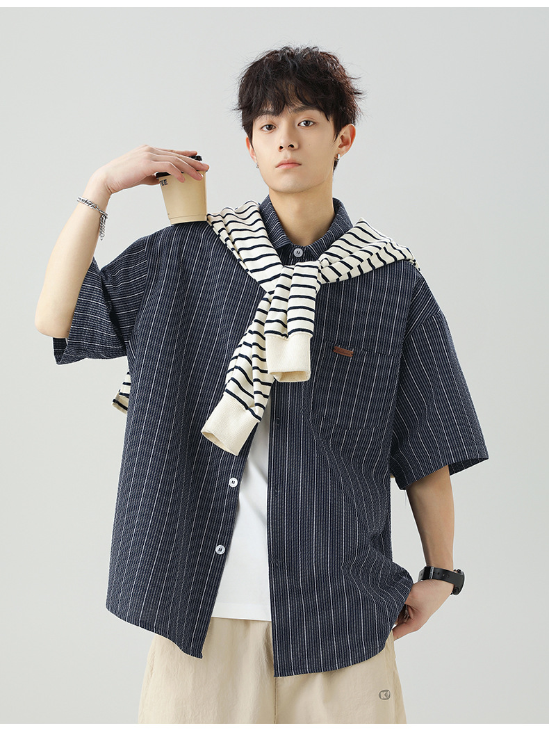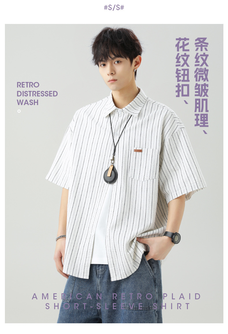 질감 있는 약간 주름진 대비색 스트라이프 반팔 셔츠 남성용 새 시즌 일본풍 루즈핏 캐주얼 라펠 셔츠 재킷스토어 가기