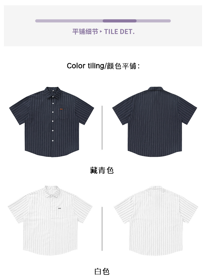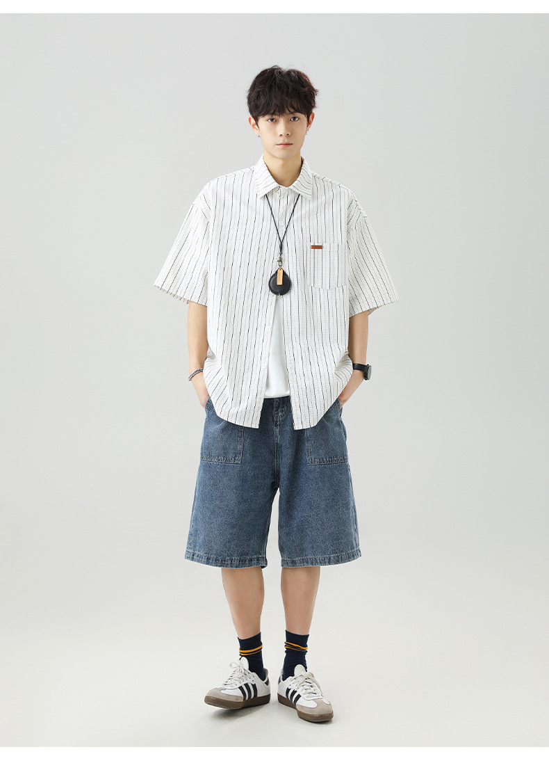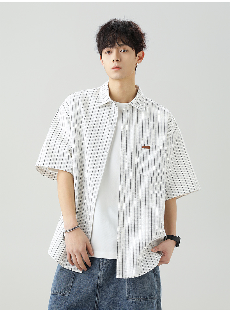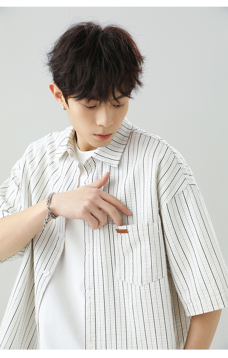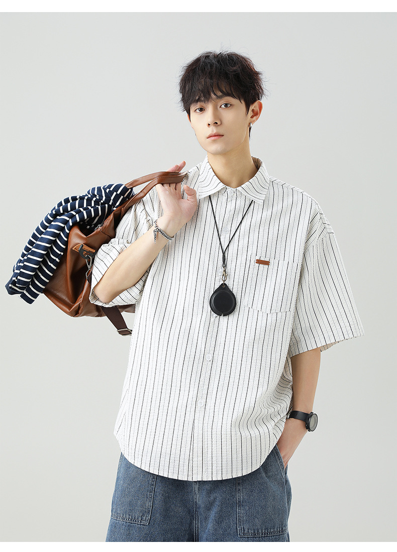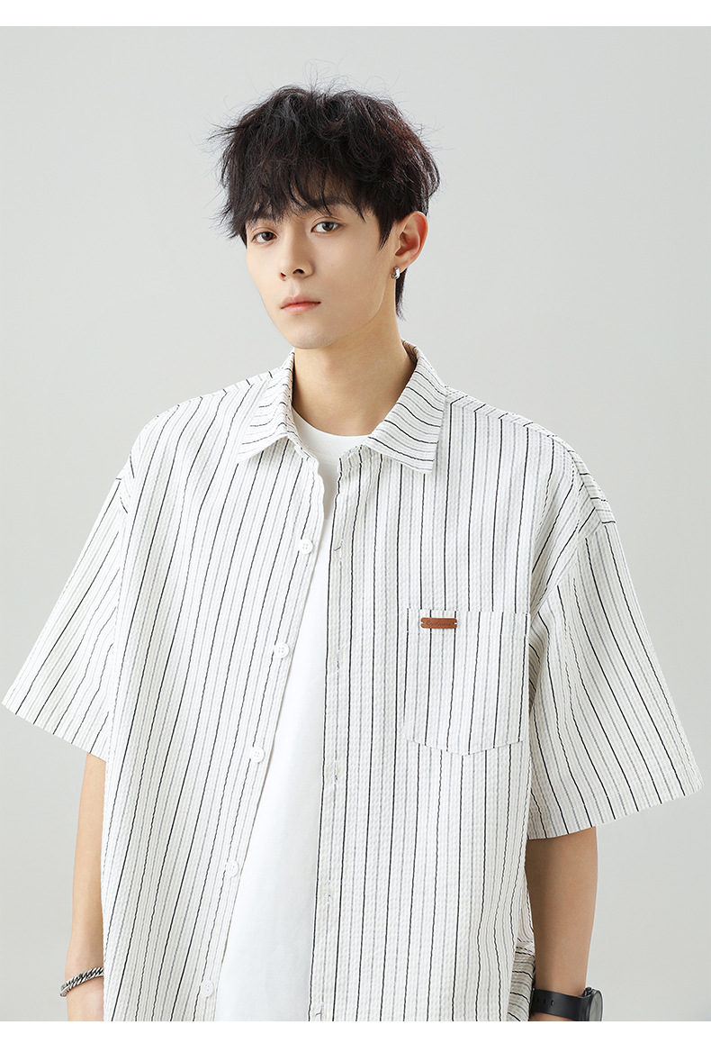 질감 있는 약간 주름진 대비색 스트라이프 반팔 셔츠 남성용 새 시즌 일본풍 루즈핏 캐주얼 라펠 셔츠 재킷스토어 가기