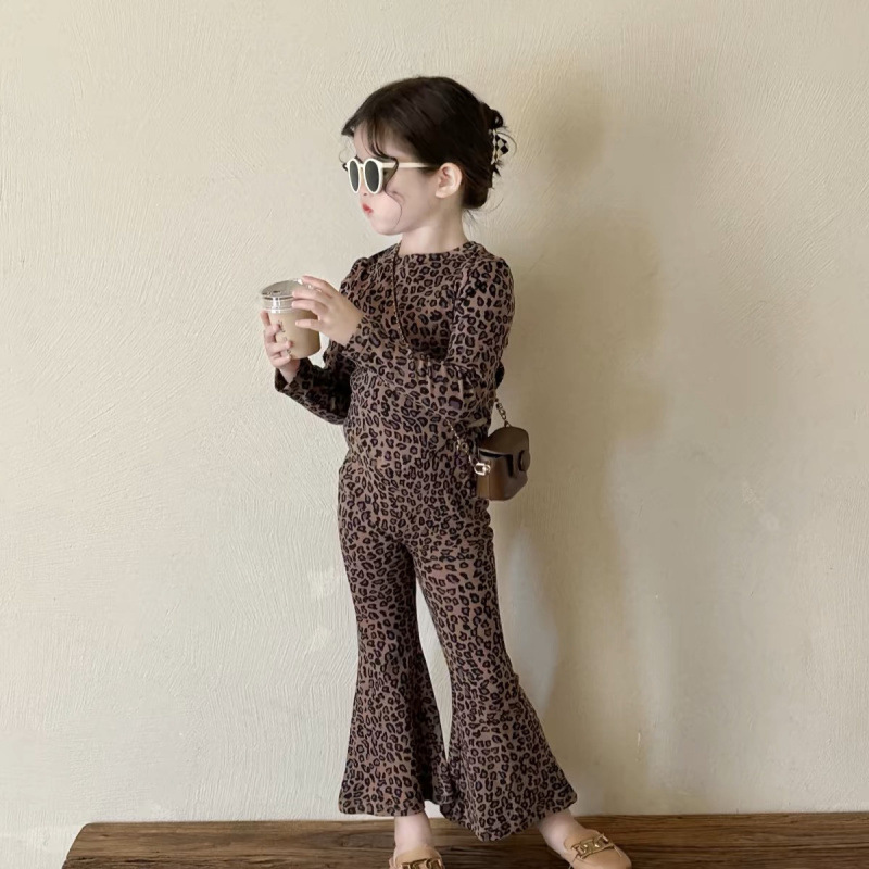 소녀 한국식 레오파드 무늬 세트 2024 가을 새 아기 탄성 니트 투피스 세트 어린이 캐주얼 올매치스토어 가기