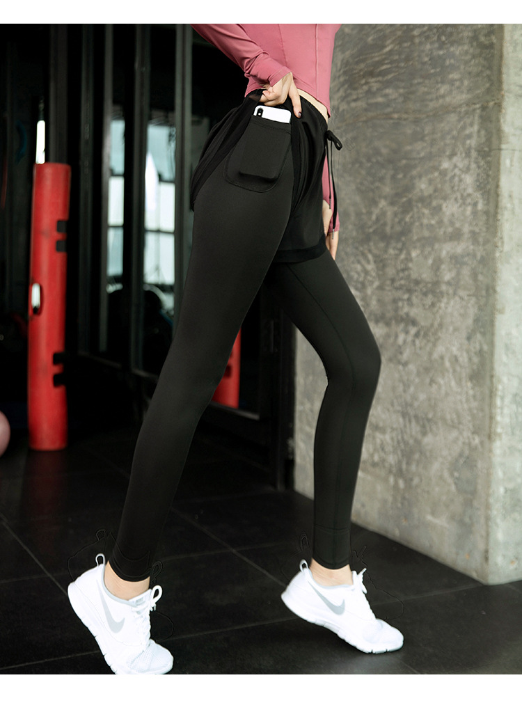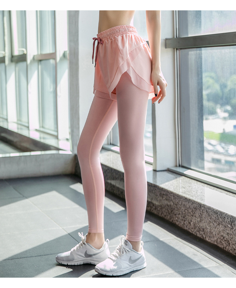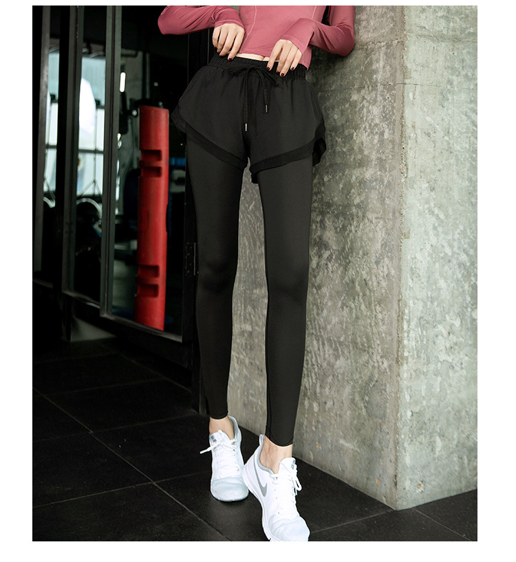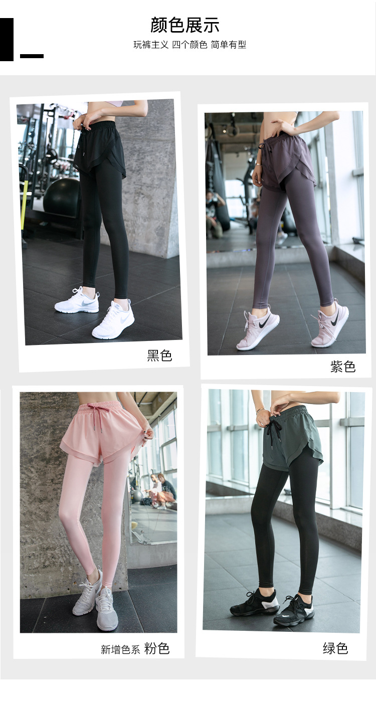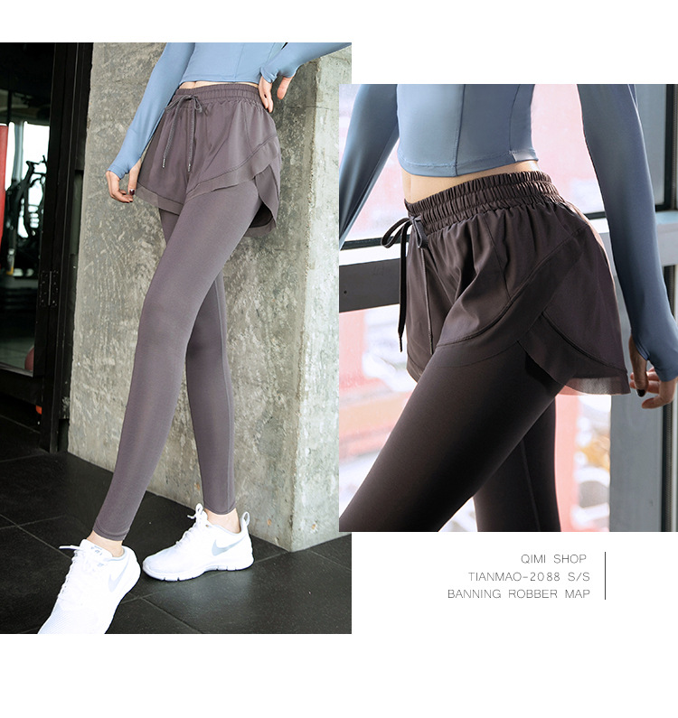인기있는 피트니스 바지 여성의 높은 허리 엉덩이 리프팅 탄성 타이트 달리기 가짜 투피스 스포츠 바지 신속 건조 외부 착용 새로운 스타일