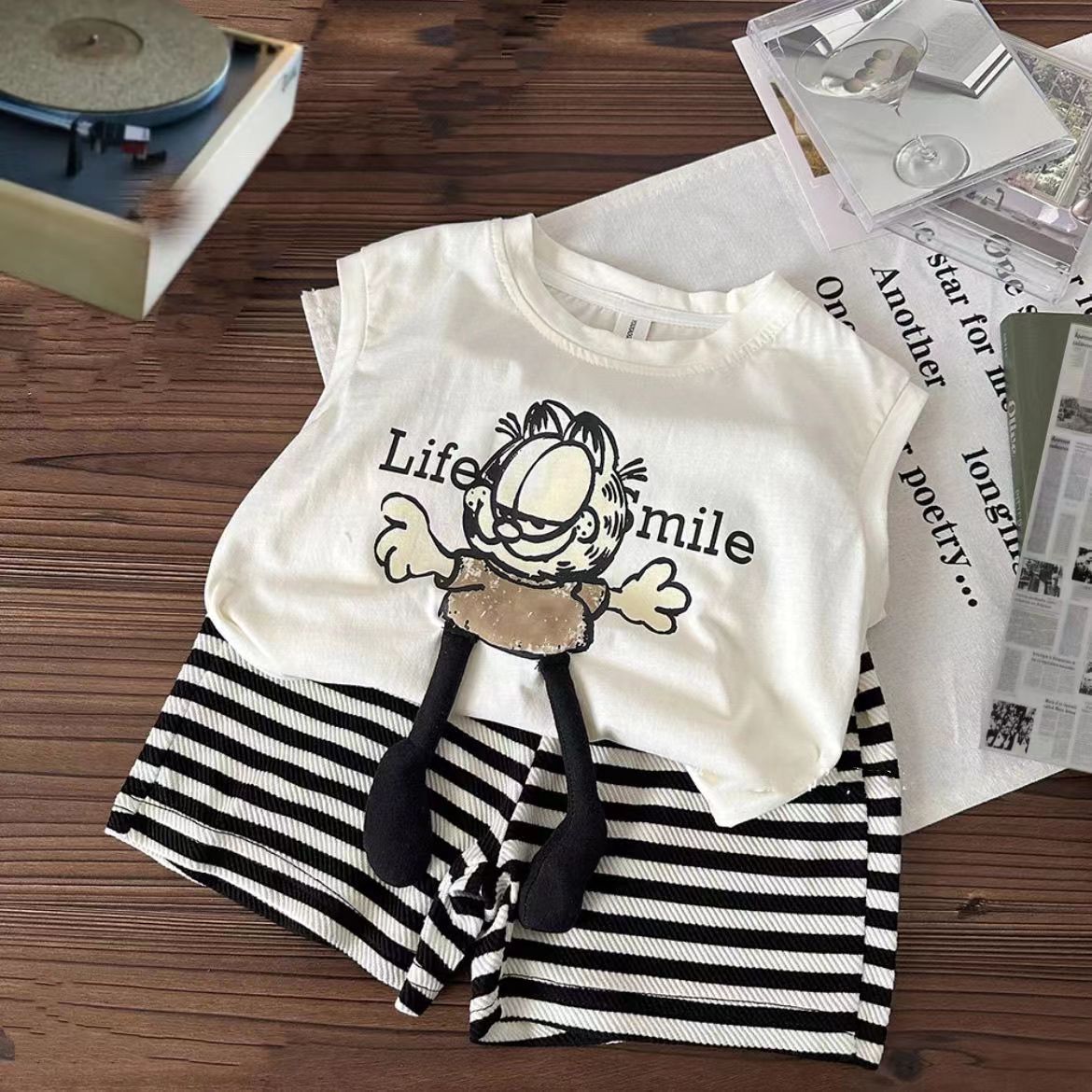 어린이 남녀 줄무늬 만화 민소매 조끼 투피스 세트스토어 가기