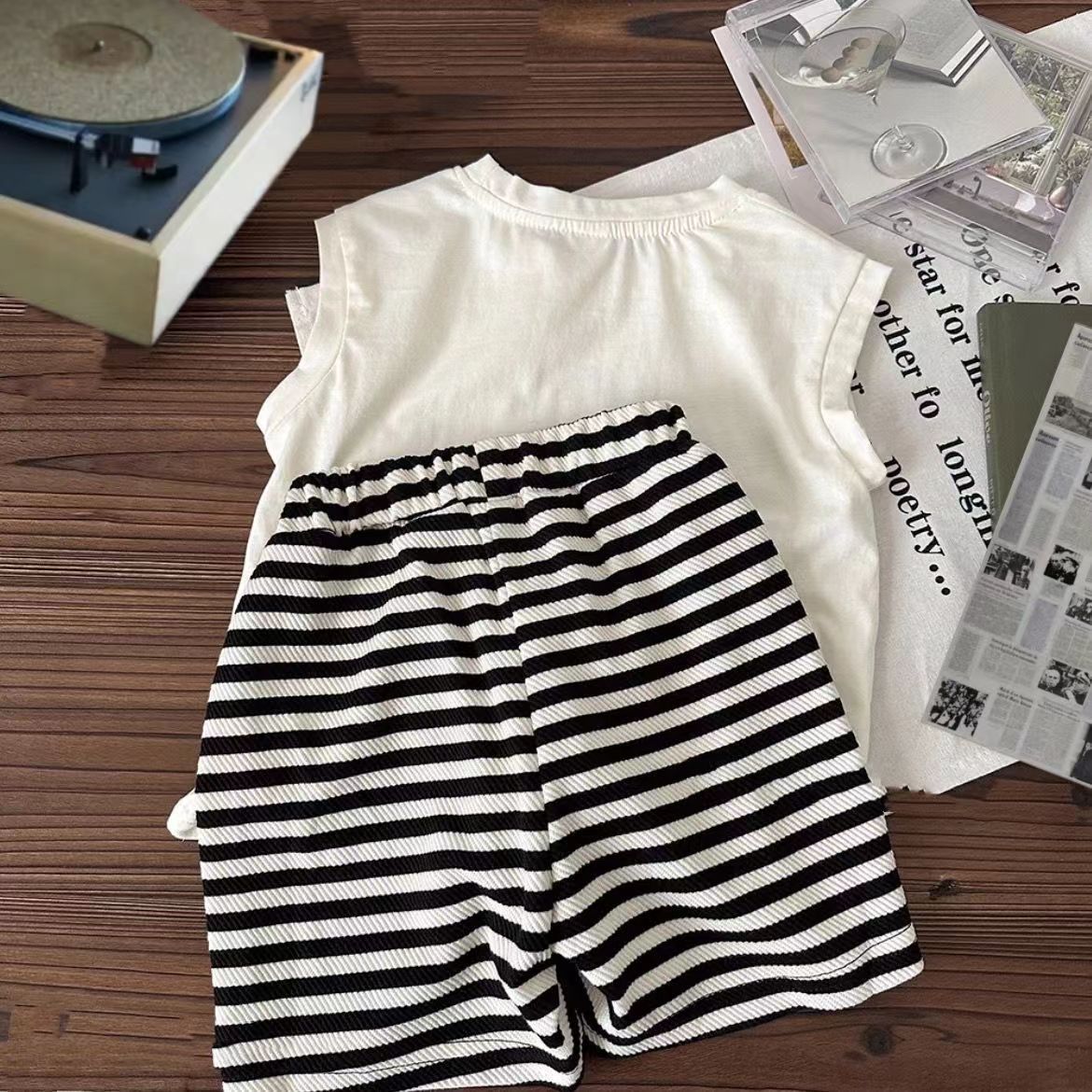 어린이 남녀 줄무늬 만화 민소매 조끼 투피스 세트