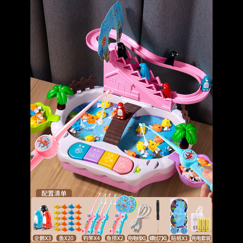 • [핑크] 펭귄 슬라이드 낚시대 세트 [충전식 버전]