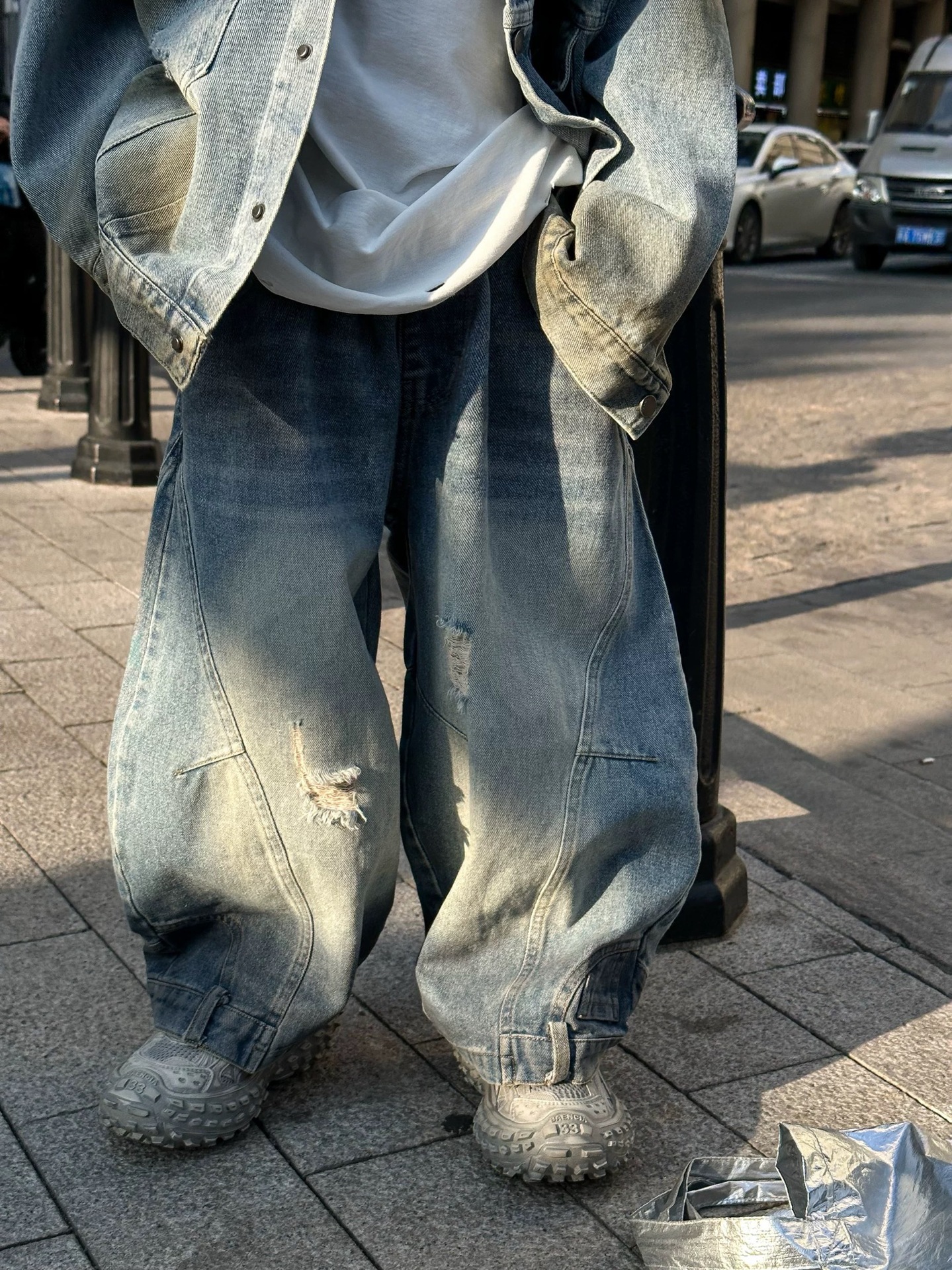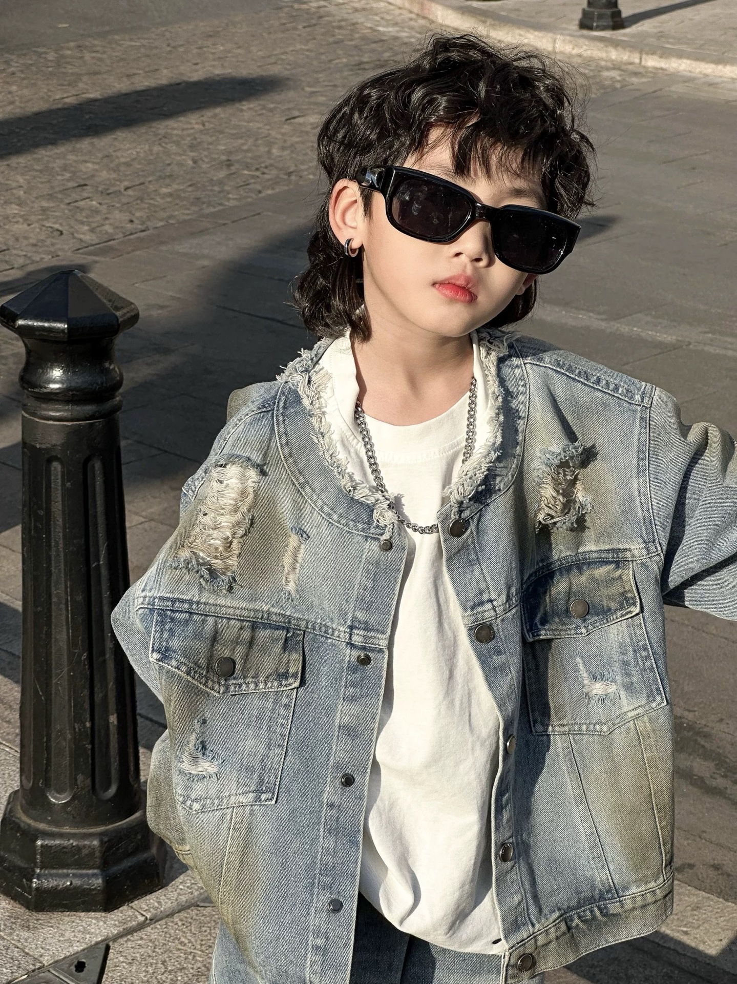 2025 년 봄 새로운 도착 소년의 한국 스타일 세련된 멋진 데님 코트 구멍이있는 어린이 씻은 오래된 잘 생긴 탑