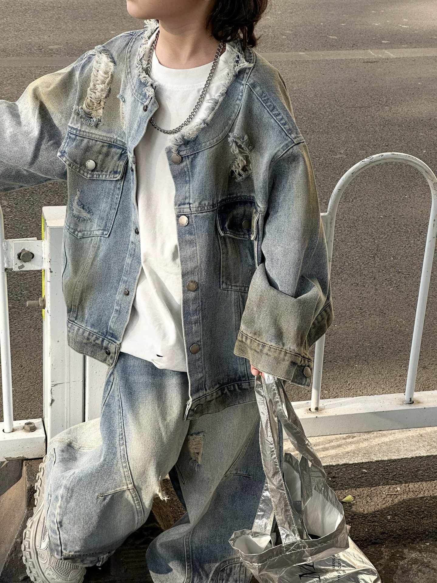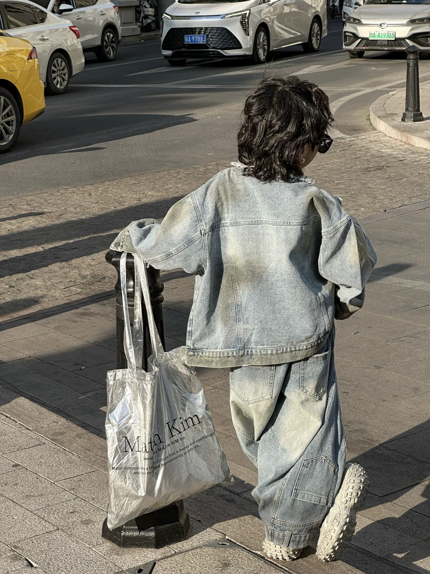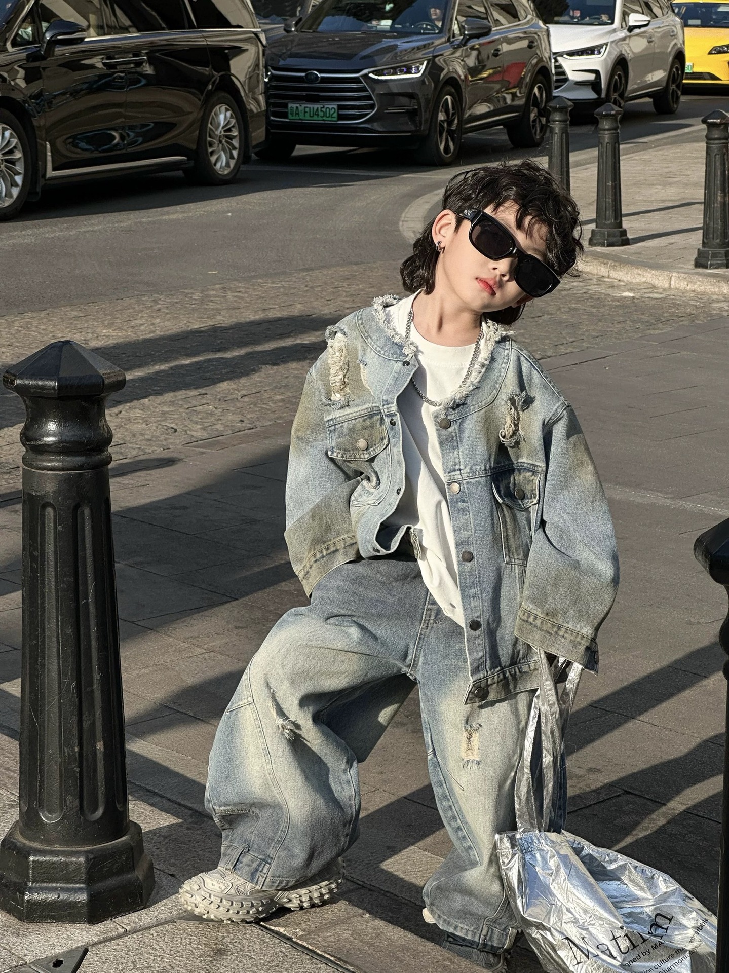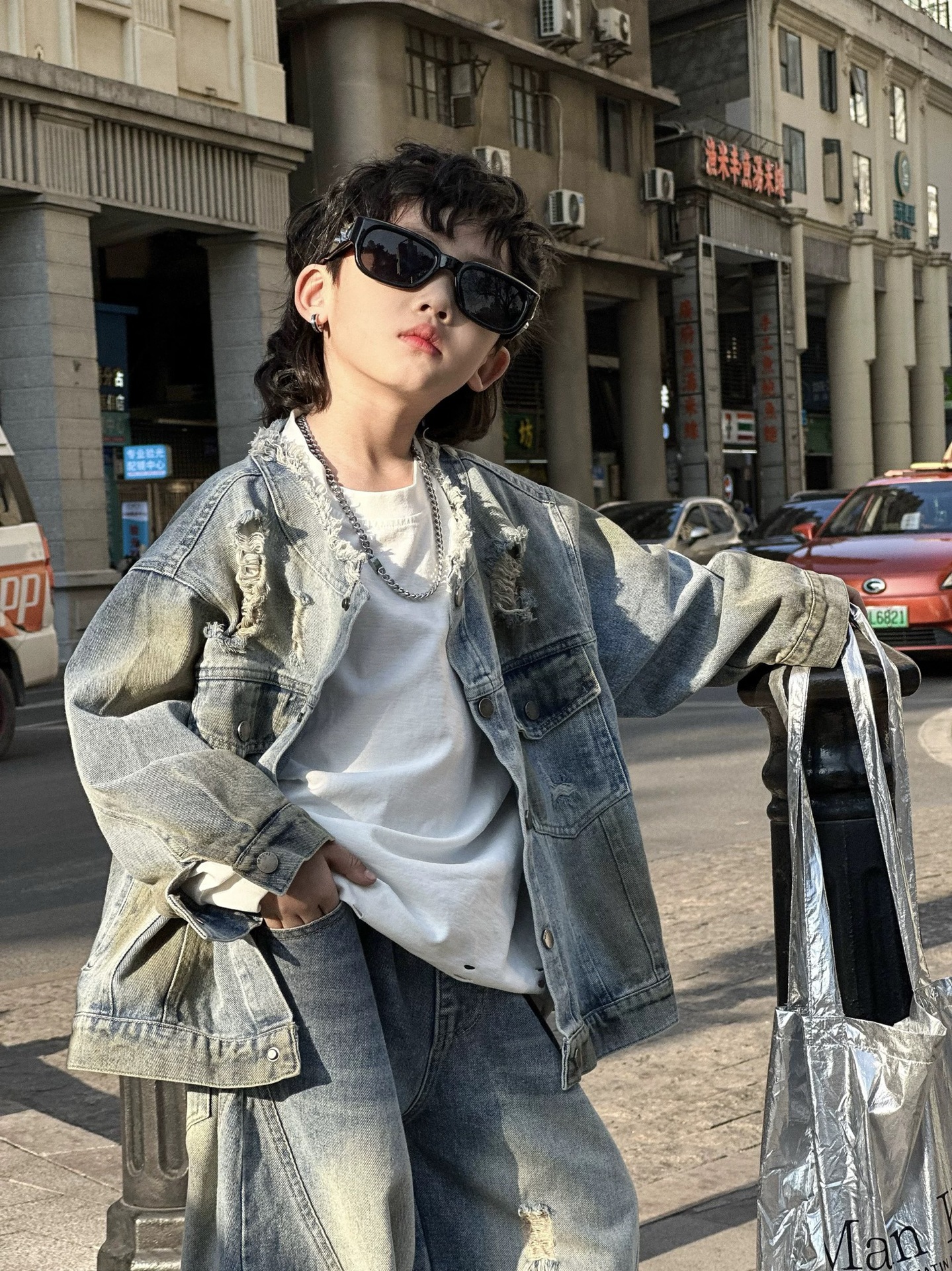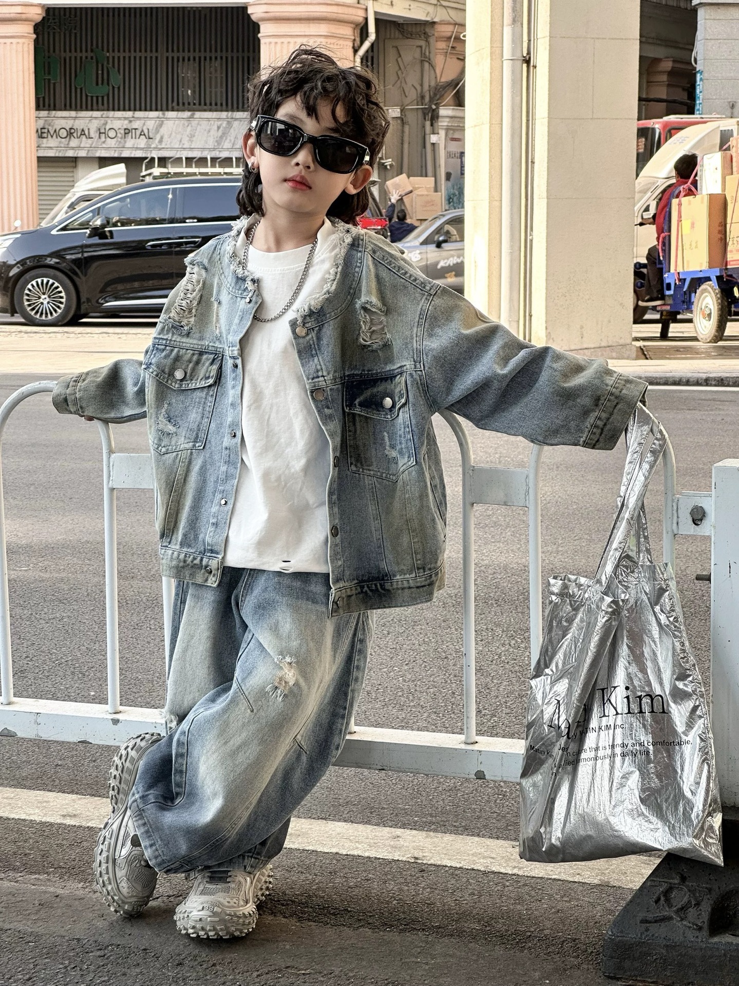 2025 년 봄 새로운 도착 소년의 한국 스타일 세련된 멋진 데님 코트 구멍이있는 어린이 씻은 오래된 잘 생긴 탑스토어 가기