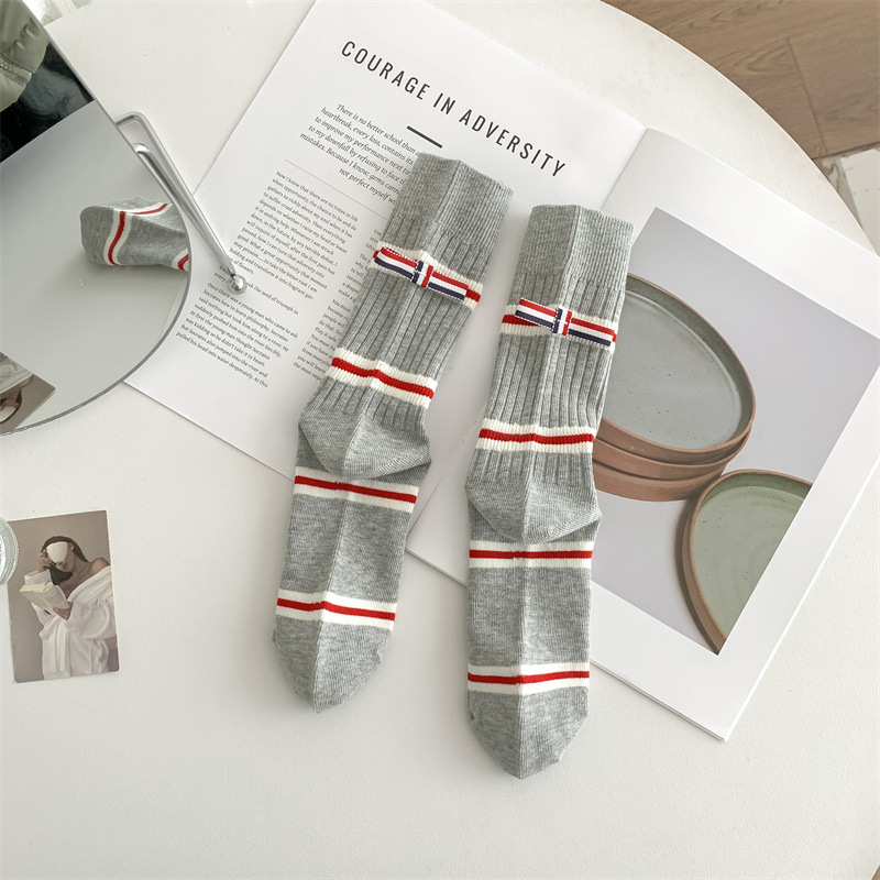 2025 봄 유럽 여성 양말 리본 활 줄무늬 면 양말 Insi 트렌디 한 틈새 색상 대비 미드 컬러 양말스토어 가기